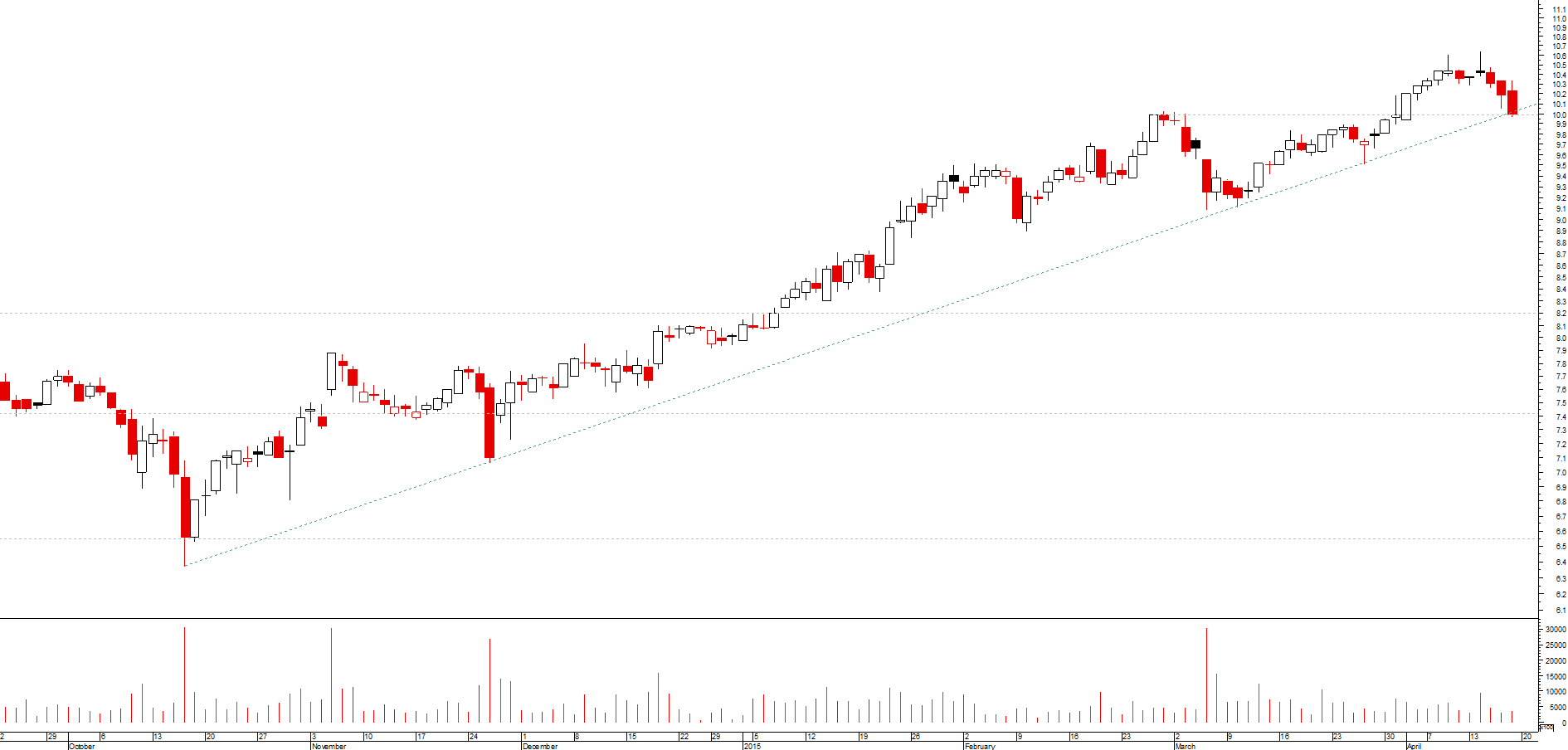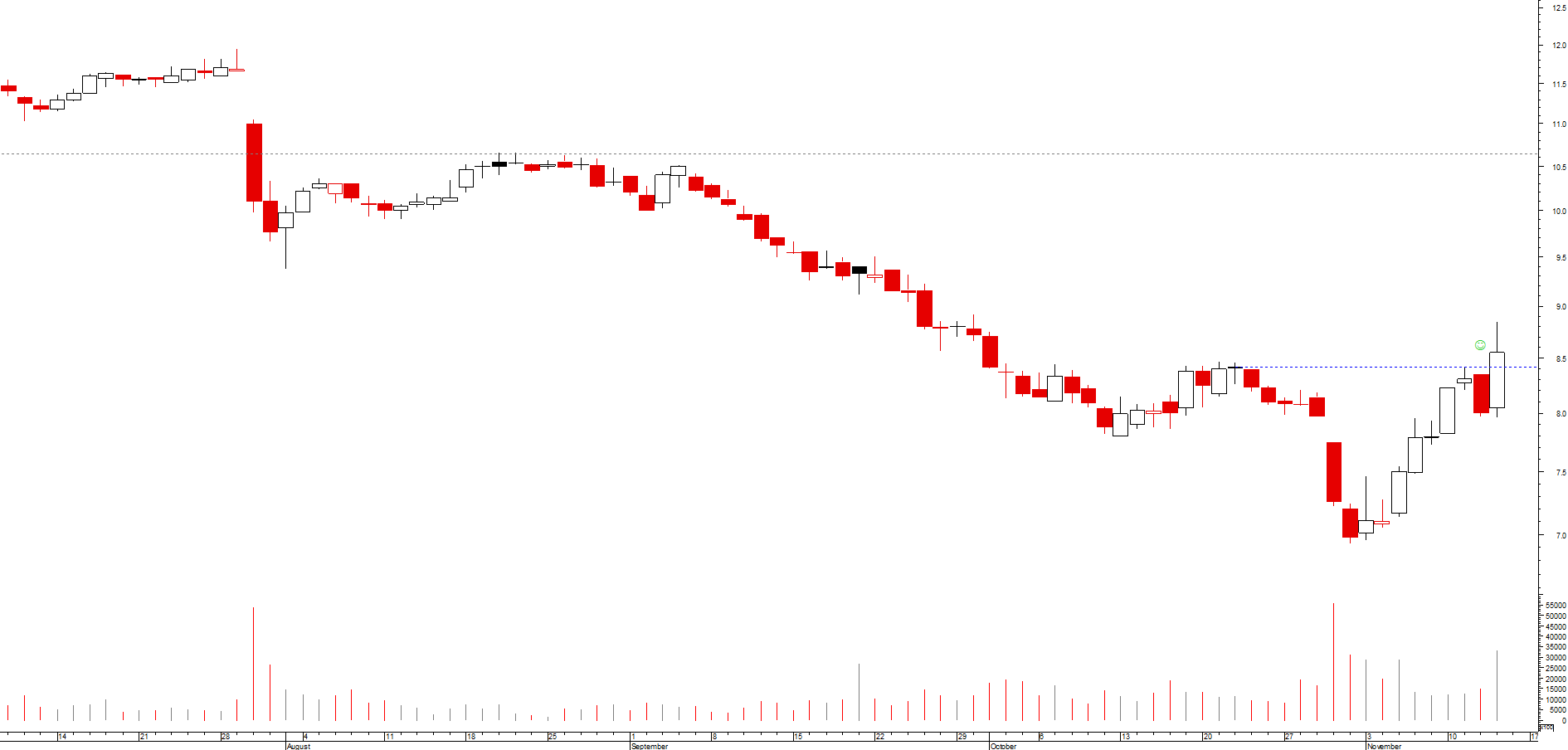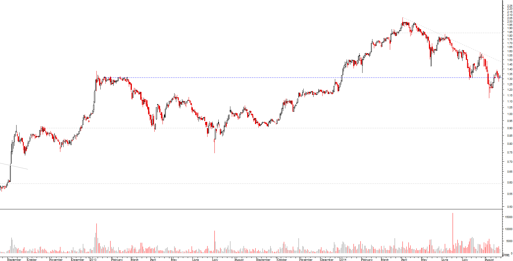 sem dúvida que no curto médio prazo o banco se encontra sob uma tendência descendente clara, que leva a que inclusivamente teste um suporte crítico, situado na zona dos 1.31 euros, nascido do máximo de inícios de 2013; caso a quebra seja confirmada, então aceito o fim da tendência mas há que olhar para trás e ver o que a cotada fez numa situação em tudo semelhante, no ano passado: pelo máximo anterior (na zona dos 0.897 euros) nasceu uma zona de resistência, que veio ulteriormente a funcionar como suporte, e que chegou a ser significativamente penetrada, tendo contudo a acção sido capaz de recuperar, ultrapassar a resistência e ir para novos voos