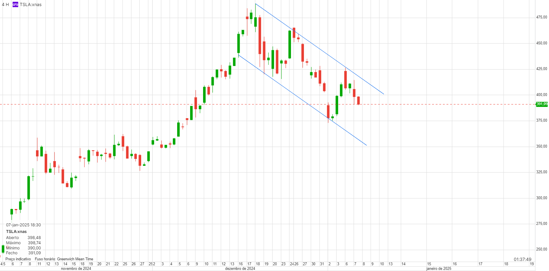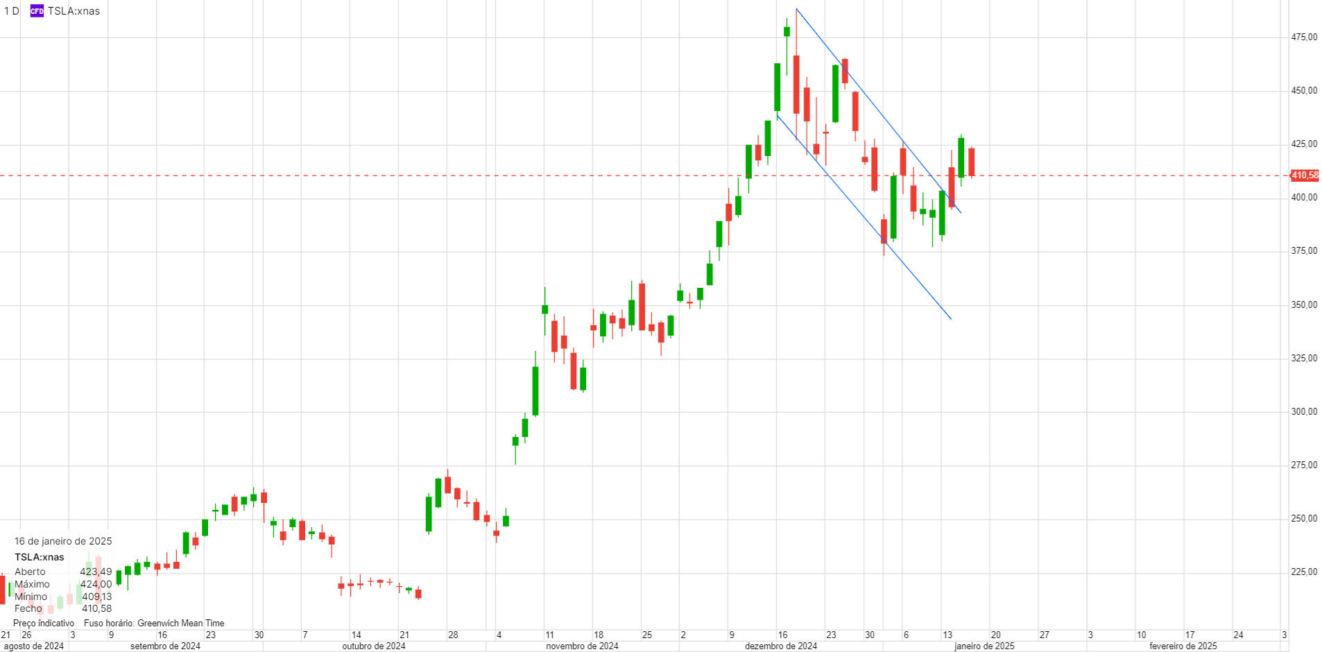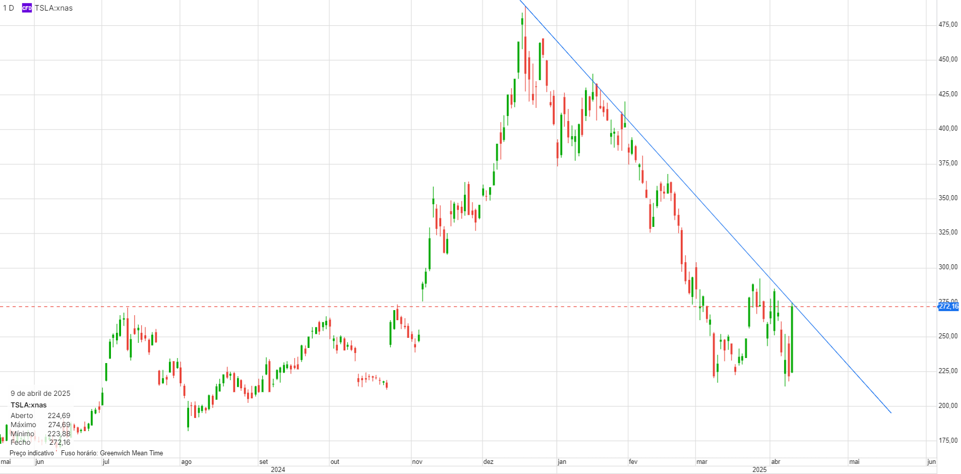 Depois do dia de hoje, irá manter as subidas? Está na linha que vem a limitar o preço desde Dezembro. Teoricamente este será um bom ponto para entrar curto, já que os problemas da Tesla não têm a ver só com as tarifas. O dia de hoje, imagino que terá sido muito relacionado com fecho de posições curtas.