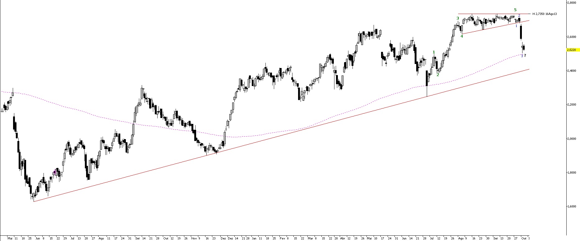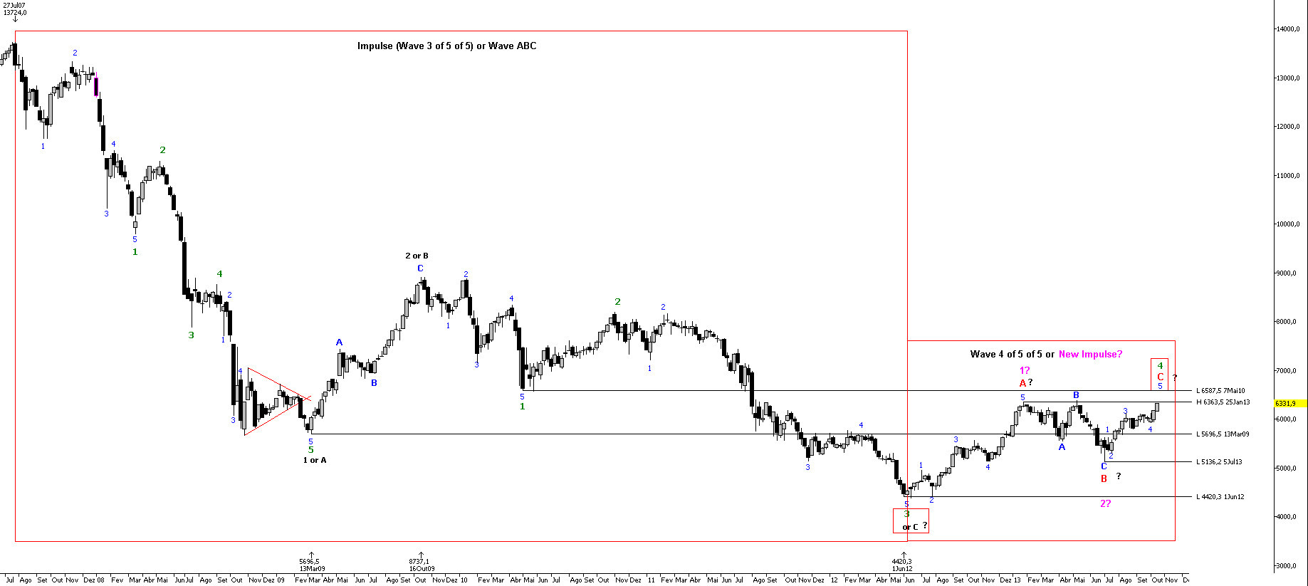 - Onda 3 - i) de Julho a Agosto; ii) em lateralização até início de Outubro; iii) desde o início de Outubro, atendendo à sua impulsividade. Com espaço para nos levar até à zona dos 7000-7200 (caso rompa a decisiva zona dos 6400, o impulso poderá ser ainda mais decisivo).