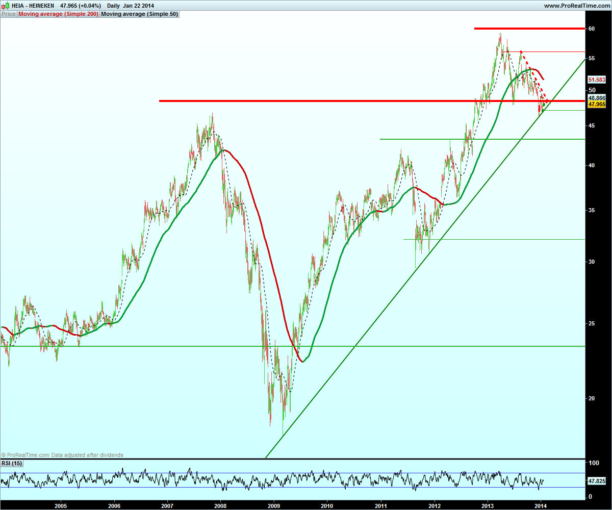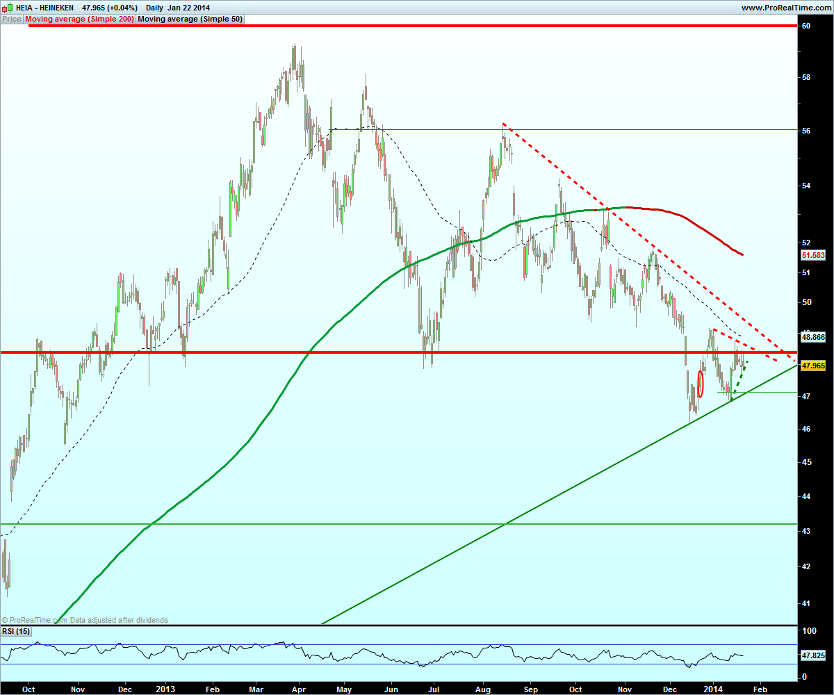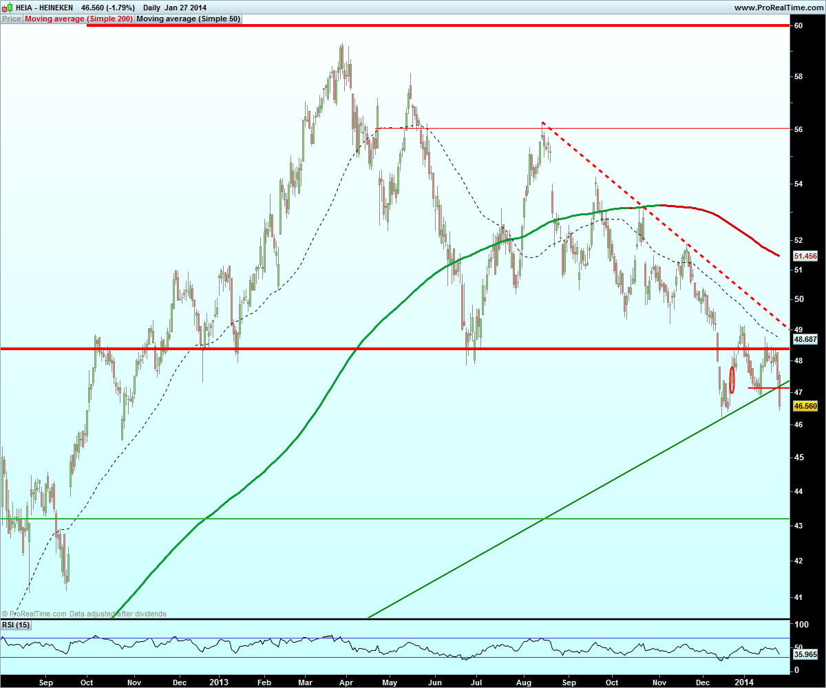 Em relação a posição na HEIA hoje foi um dia muito importante fechou abaixo da LTA de longo prazo e deu um forte sinal de inversão da tendência, também alterei o stop loss para um trailing stop e fico a aguardar uma quebra amanha do suporte de curto prazo nos 46.20€.