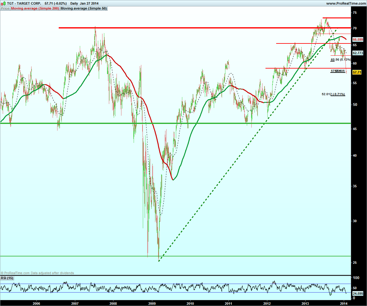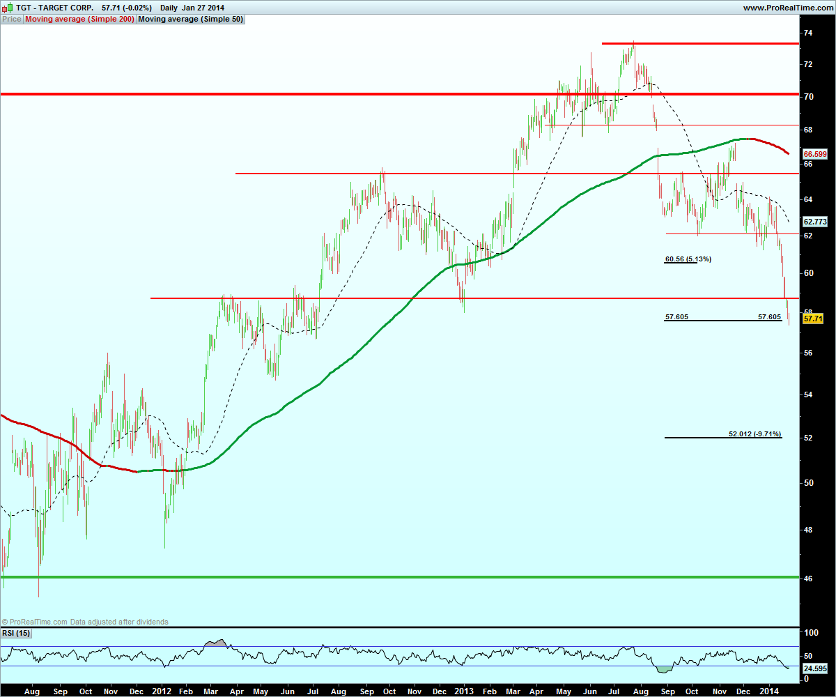 Foi também aberta uma nova posição short na TGT (Target) a 57,60$ com um peso de 10% da carteira, tem como objectivo os 52$ (+10%) e stop loss nos 60.50$ (-5%), o RSI já se encontra a dar sinais de que o movimento pode estar a perder força juntamente com a vela de hoje porem tudo indica que os bears continuam a dominar.