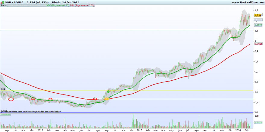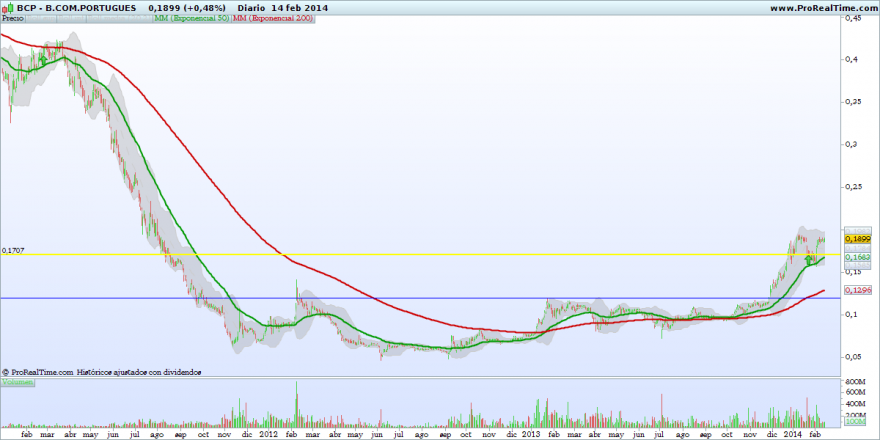 Técnicamente, depois de em 2009-2011 ter vivido bons momentos, acabou por cair até fevereiro 2013 quando fez o mínimo. Depois criou ali uma resistência na casa dos 5.30 usd que foi quebrada em julho 2013 com bons volumes colocando-se a cotação acima da mm200. Em seguida fez pullback ao suporte (anterior resistência) e volta a subir de novo com volume. Nos dias seguintes ocorre a golden cross. Agora anda alí na luta numa zona de resistência na casa dos 6.50 que já fora suporte e resistência em 2012.