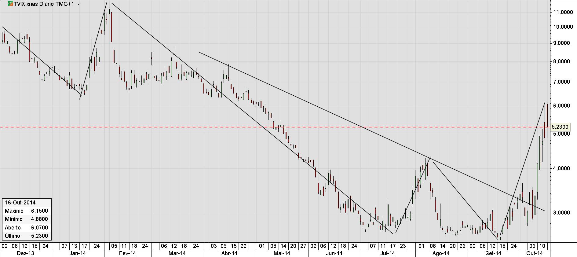 Assim como se pode observar pelos gráficos do TVIX:xnas neste período o fenómeno do medo, da desaceleração económica mundial, a Ucrânia, o Islão, o Ébola, me parece que veio para se estender durante um período mais alargado. Antes mesmo de se pensar numa recuperação é preciso ir de encontro a um novo fundo e novos dados que o manifeste.