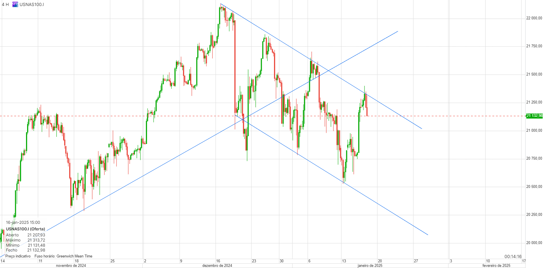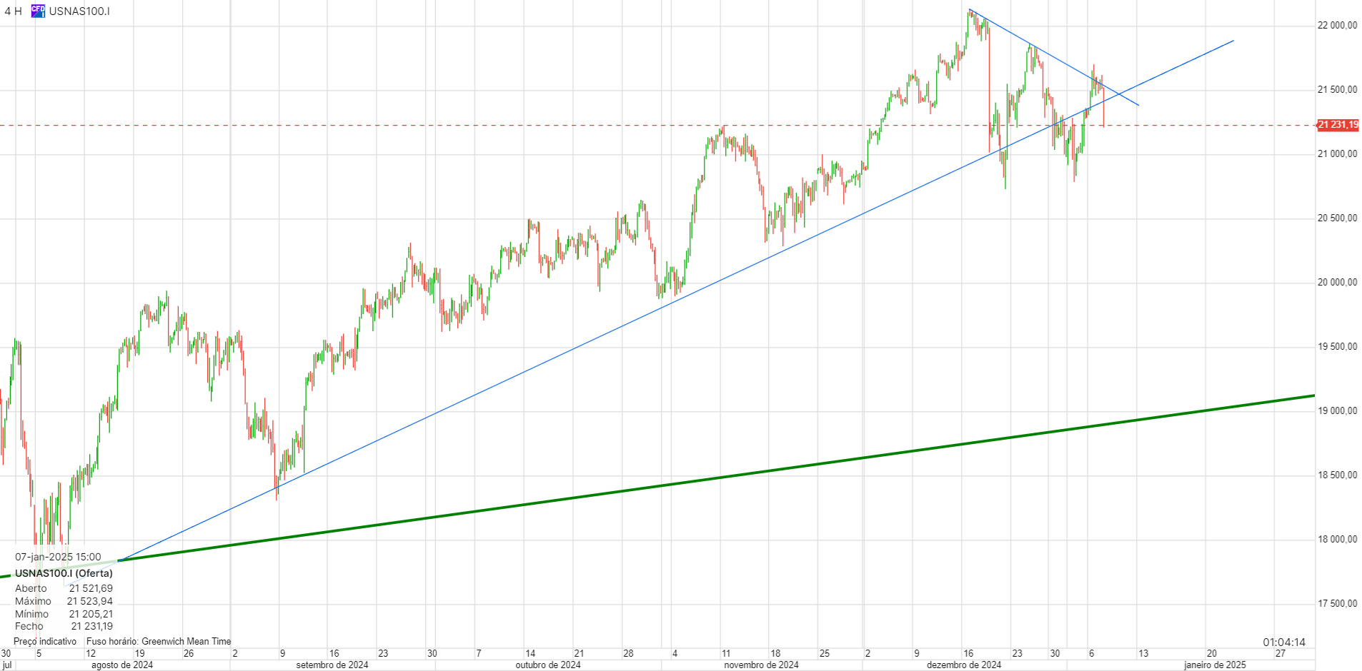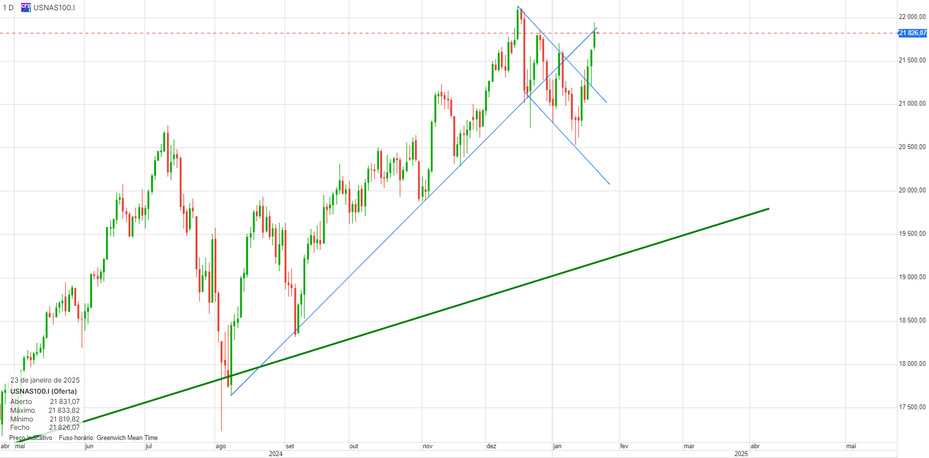 Agora, estou a negociar a linha de tendência descendente a azul. Abri ontem umas posições curtas, na zona dos 21450, quando ficou claro que estava com dificuldades em manter as subidas.