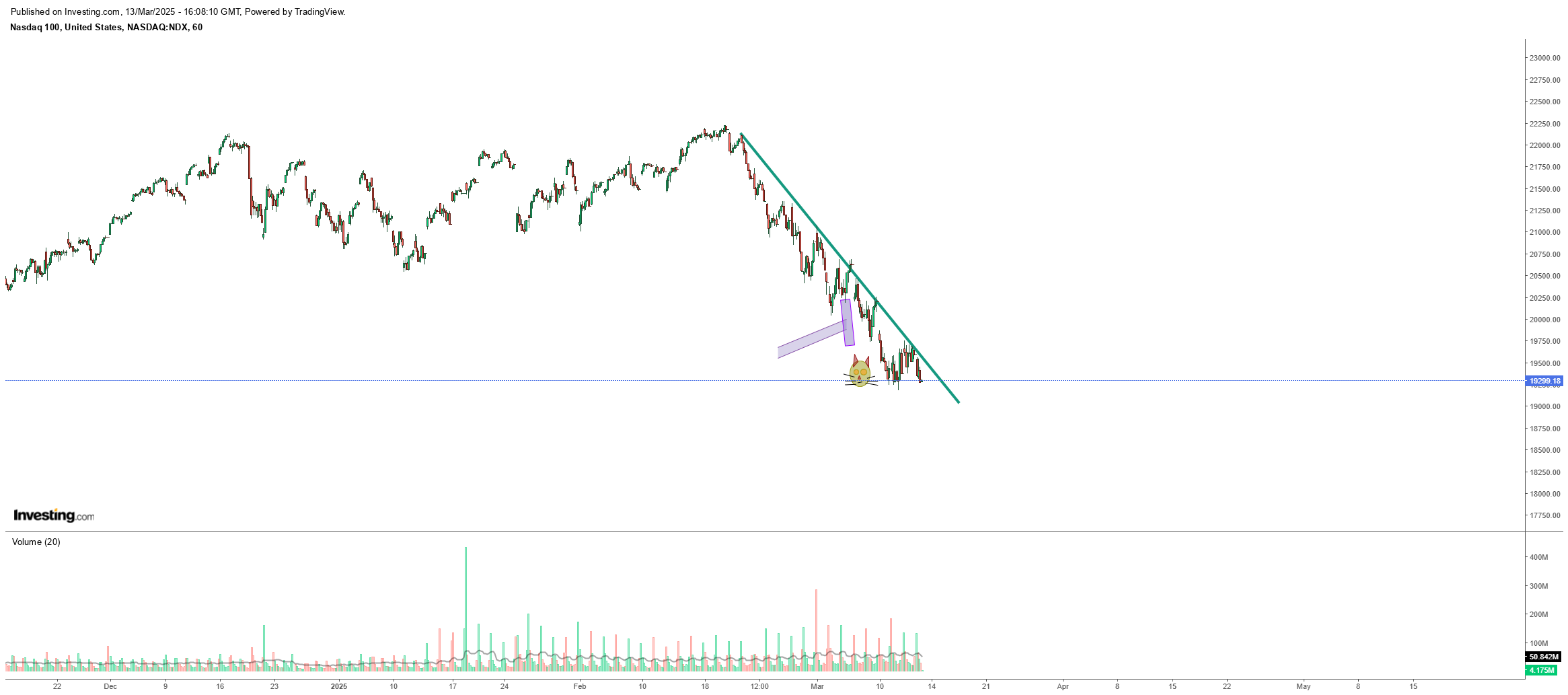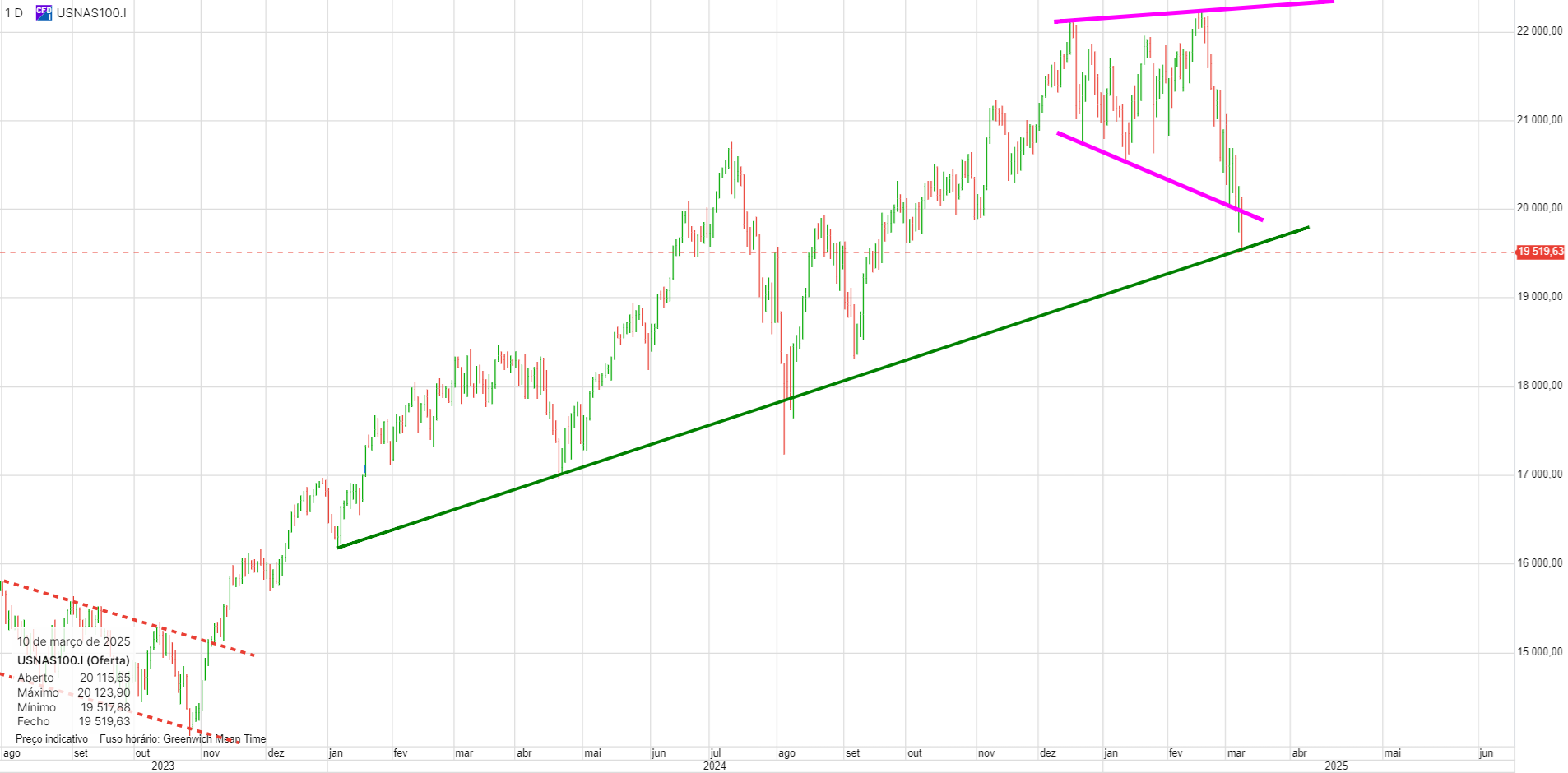 Neste momento entrei longo, a apostar numa reação aos 20.000 e à linha a rosa, que pode ser uma broadening wedge.