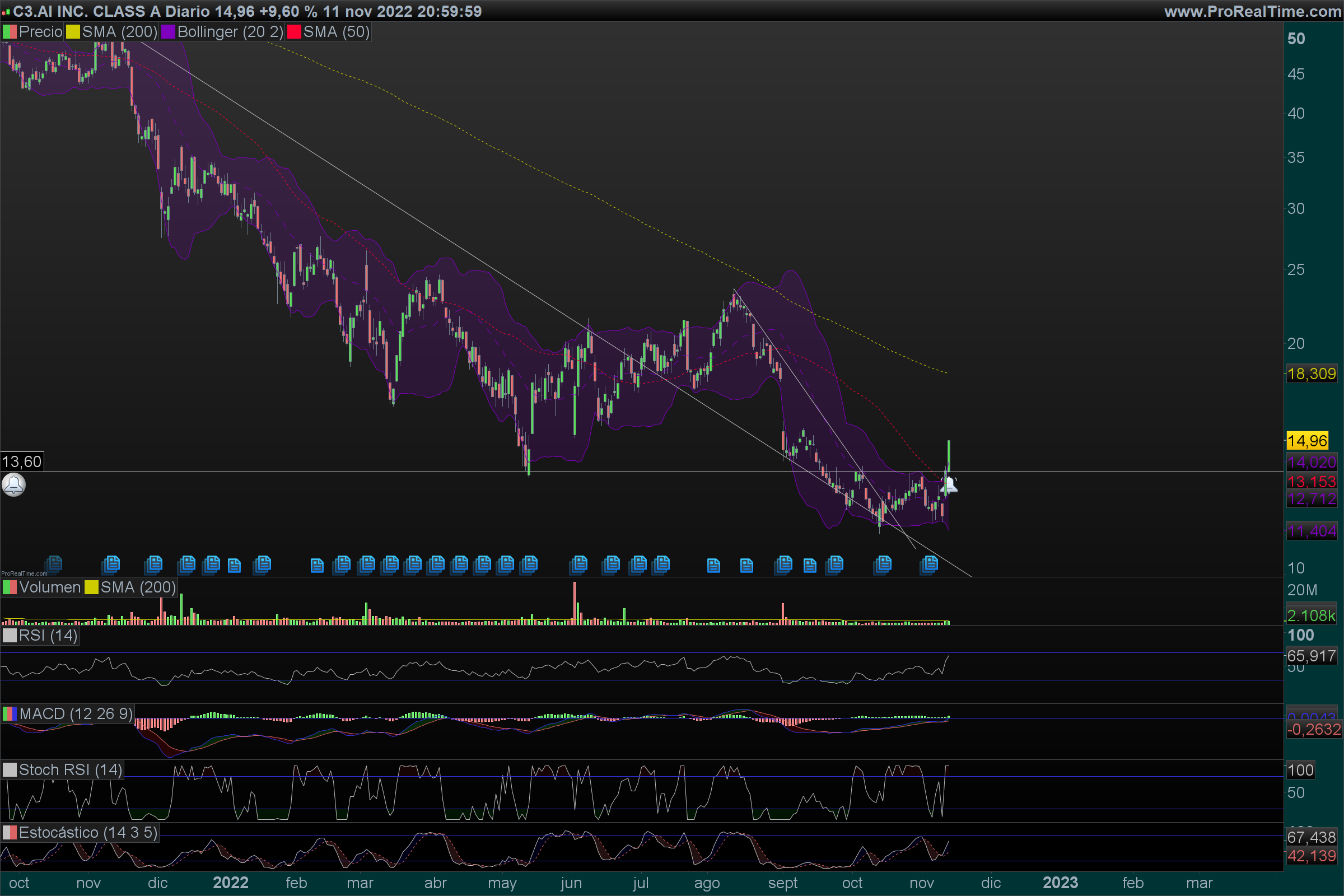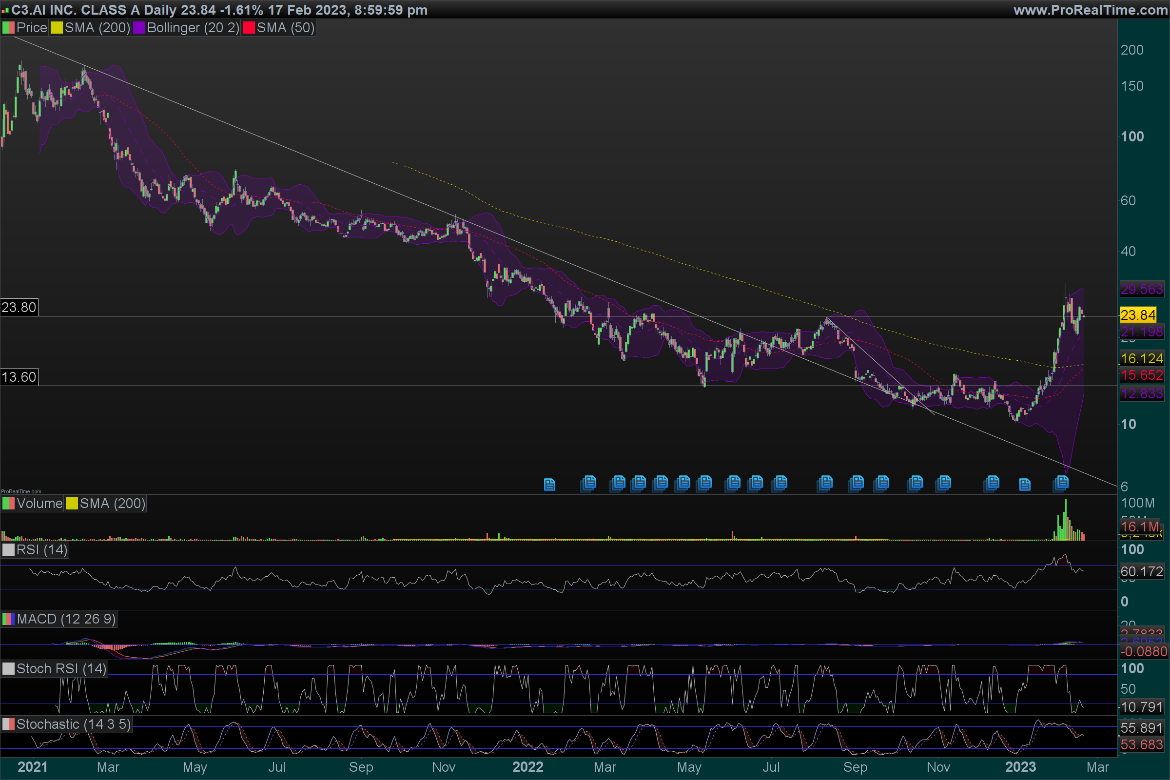 O que aconteceu para justificar esta valorização? Do ponto de vista fundamental nada aconteceu. A empresa apresentou resultados trimestrais em Novembro, e foram dentro do esperado. O crescimento das receitas foi de apenas 7% YoY e as margens não apresentaram melhorias com a margem operacional a ser negativa na ordem dos -100%. As margens não-GAAP melhoraram mas à custa do aumento de SBC (stock based compensation ). Então o que justifica esta subida substancial da cotação? Basicamente o mercado apercebeu-se da importância da AI (possivelmente devido ao surgimento do chat GPT) e encontrou esta empresa nomeada líder pela Forrester a transacionar a grande desconto. No último mês têm sido publicados numerosos artigos sobre esta empresa o que prova a atenção que a empresa entretanto atraiu.