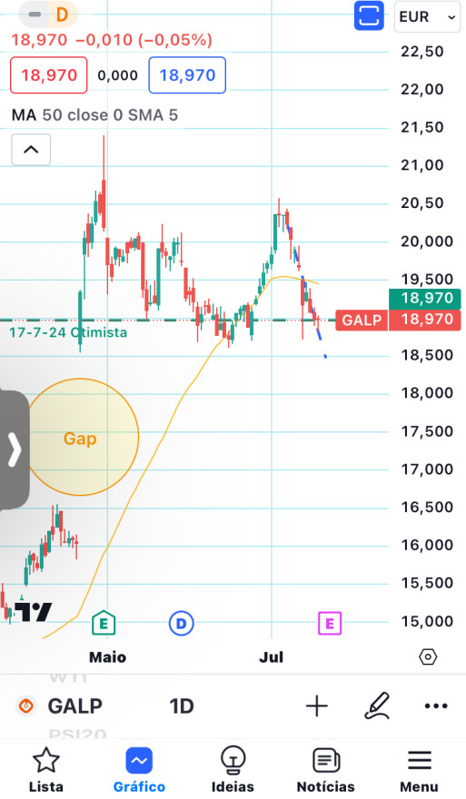 A Galp desceu hoje, mas também não parece estar com muita vontade de descer, porque recuperou na quinta feira parte do que desceu nesse dia e hoje desceu pouco. Acho que é mais provável que ela suba e não desça para fechar o gap, mas por causa do gap acho arriscada e por isso preferi dizer que ficava neutro.