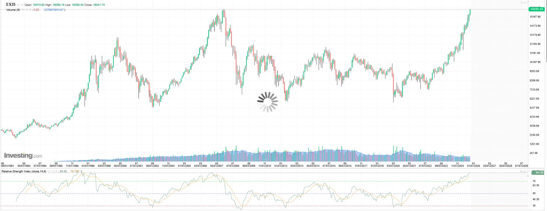 É normal que o Nikkei depois de fazer máximos após muitos anos sem fazer (desde 1989), o preço acelere. Isso também aconteceu em 2013 com o SPX e agora já estamos em 2025, e continua a subir. Estou também à espera que aconteça o mesmo com o Eurostoxx50. Escrevi sobre isso já há vários meses, acho que até foi no ano passado e não este ano.