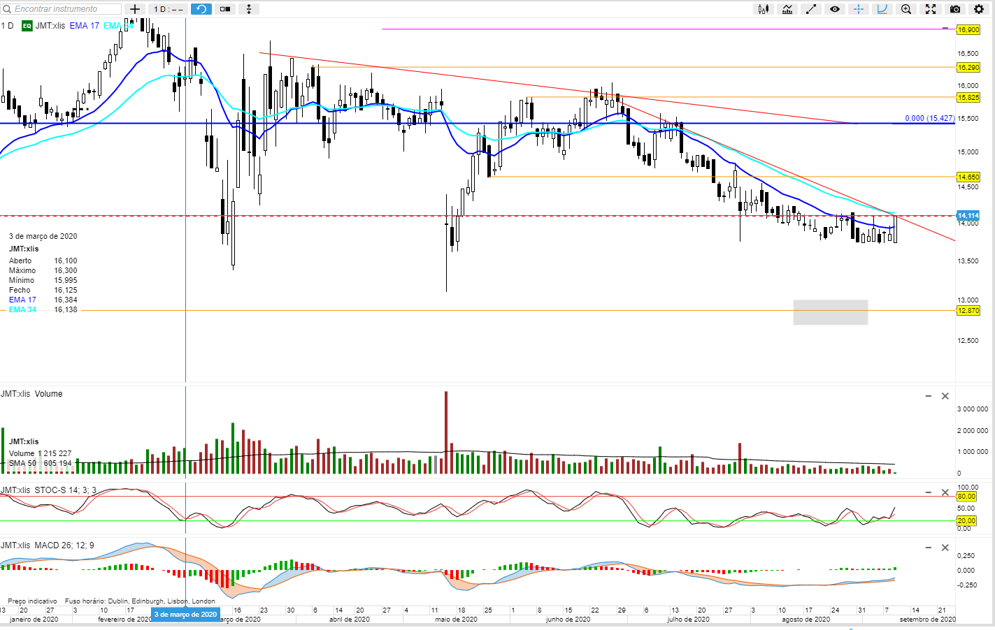 Tenho uma linha nos 12.87€ a marcar um mínimo em fecho de anterior fundo de maio que está 12.89€ e também por ter outras expectativas a curto prazo para a JMT.