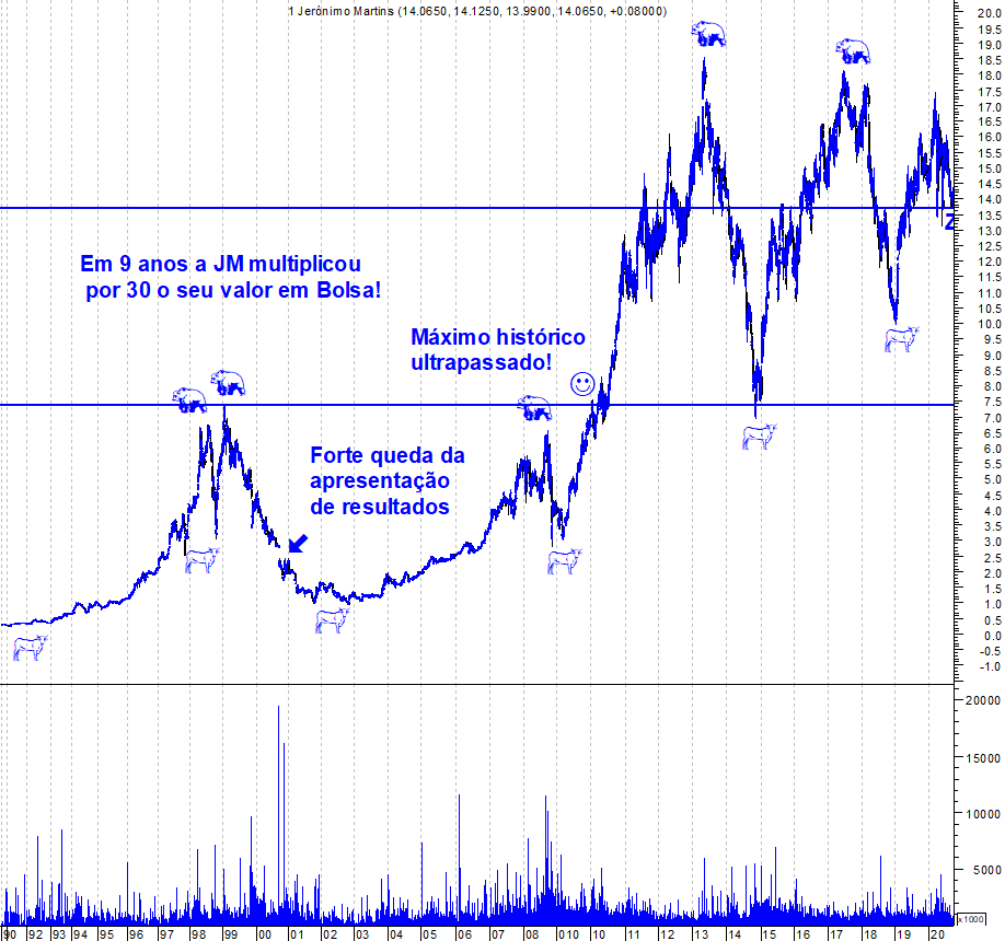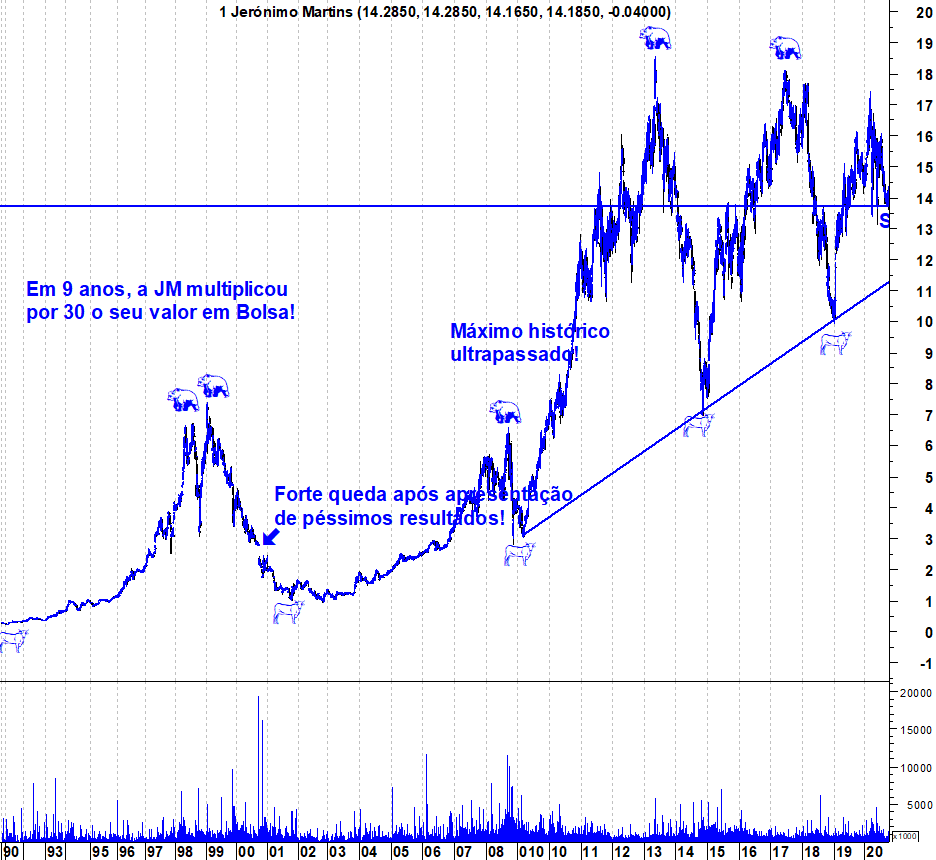 Deixo aqui os gráficos actualizados da Jerónimo Martins, numa altura em que o suporte continua a aguentar. O gráfico de longo prazo também é interessante para vermos a verdadeira montanha russa desta acção ao longo dos anos.