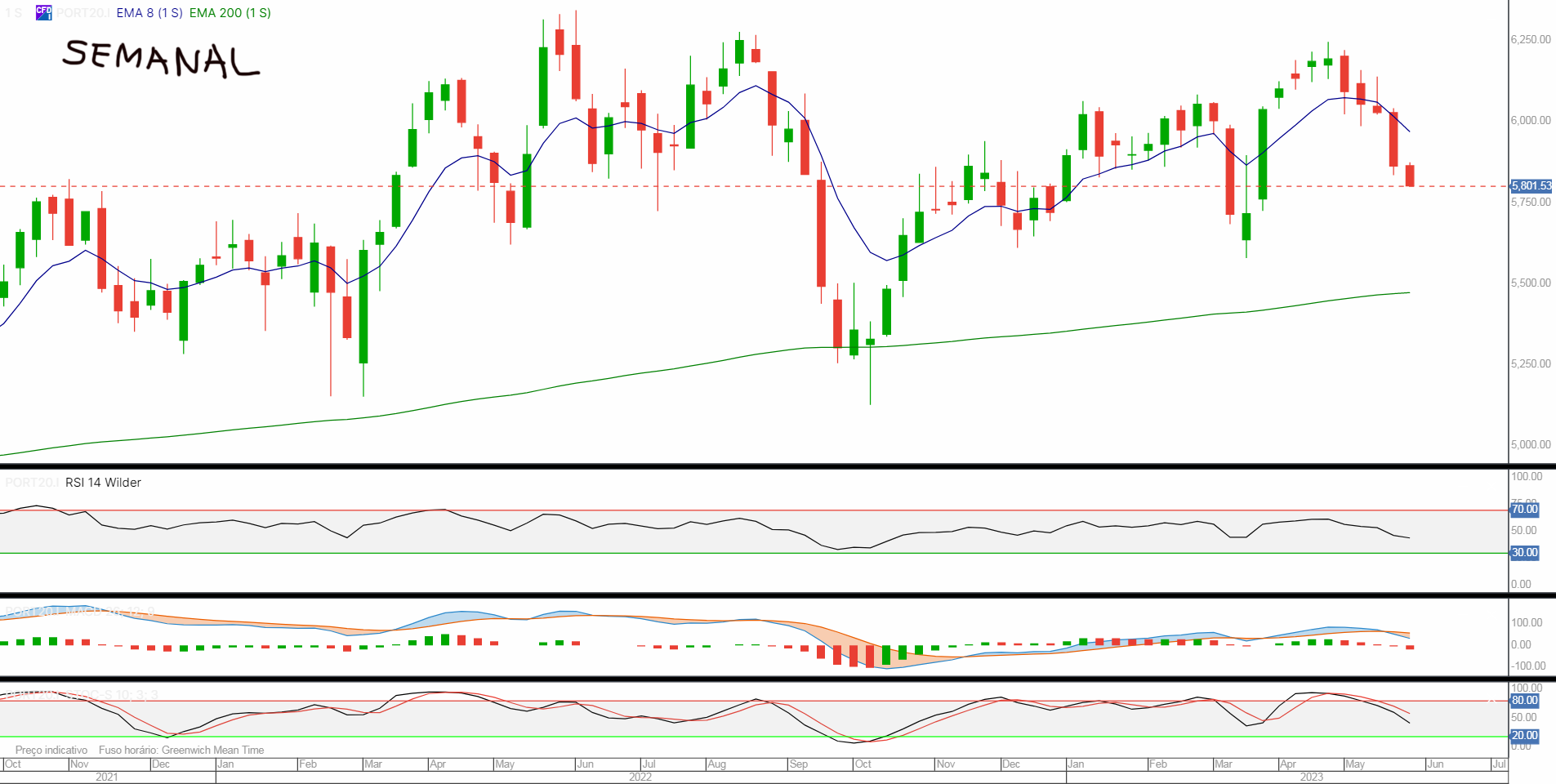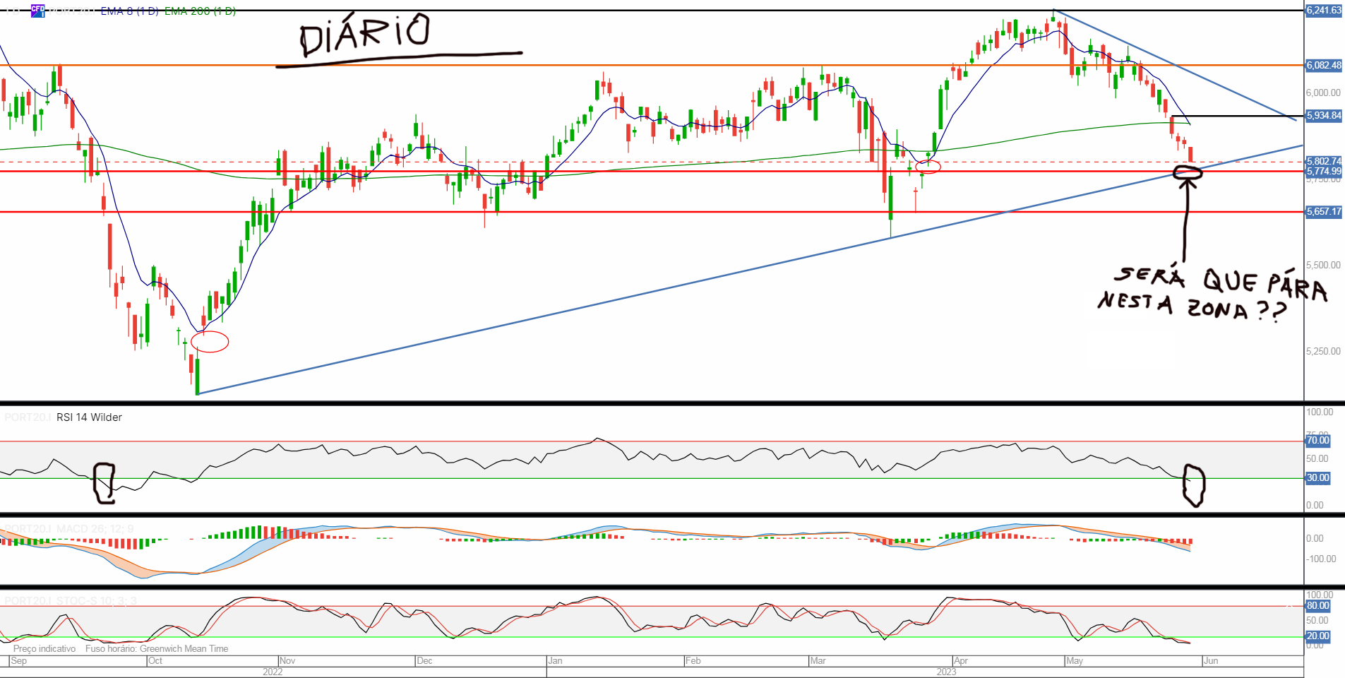 Resumindo, o mais importante neste momento é que a tendência do PSI20 é ascendente desde 2020 e que deixa de ser ascendente se descer abaixo de 5292.