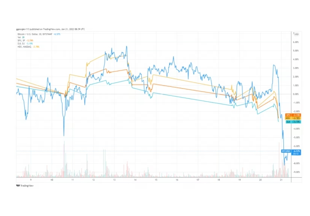 Há uma correlação, cada vez maior, entre a cotação do Bitcoin e a cotação do Nasdaq e do S&P. O que me leva a pensar que o capital especulativo que faz movimentar as duas principais Bolsas Americanas é o mesmo que movimenta o Bitcoin.