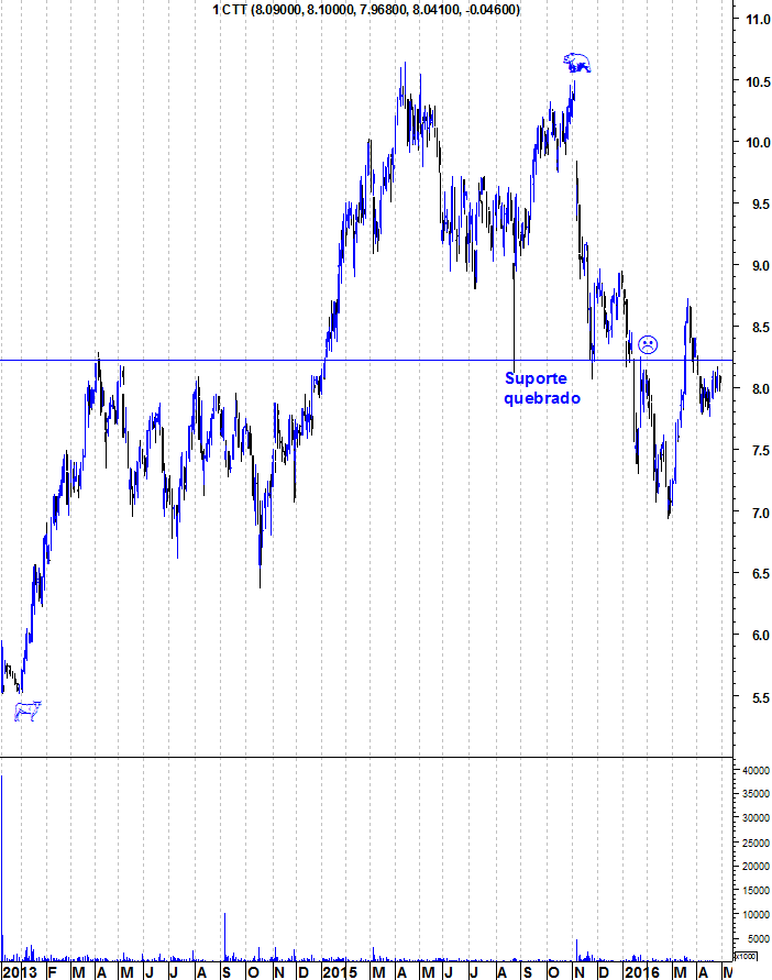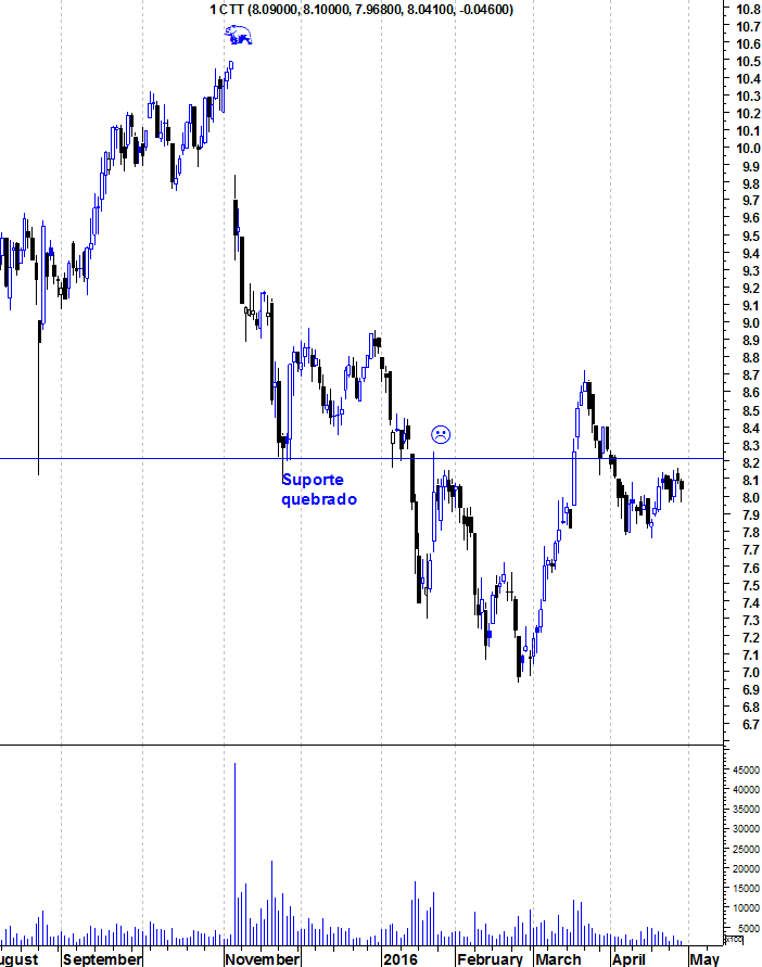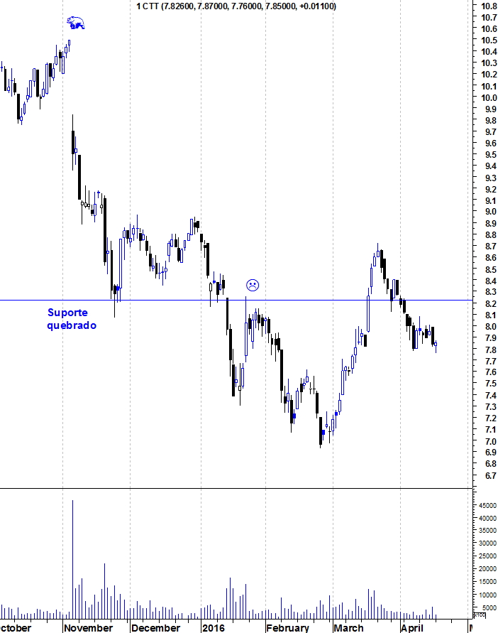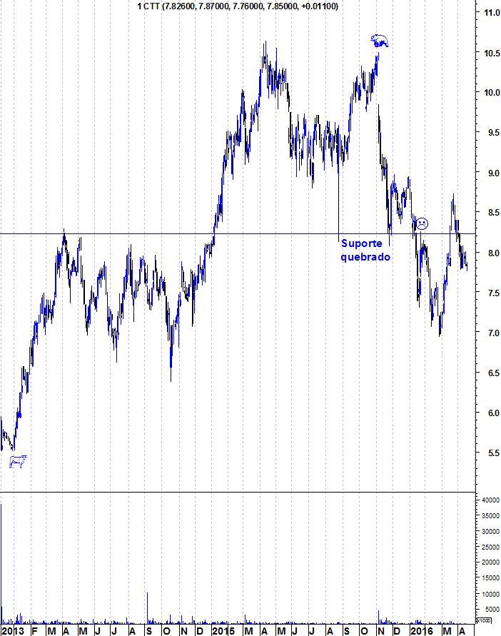 Além do acentuado “gap” em Novembro do ano passado - que parece ter marcado um novo ciclo nos CTT - a acção quebrou o importante suporte horizontal na zona dos 8,20 euros, num claro sinal de fraqueza, algo que nunca tinha acontecido nos seus quase 2 anos e meio de presença em Bolsa. Quando uma acção começa a apresentar padrões diferentes daqueles que têm marcado os últimos anos (neste caso, todo o percurso em Bolsa pois é recente) temos que tirar ilações, pois é um sinal que algo mudou.