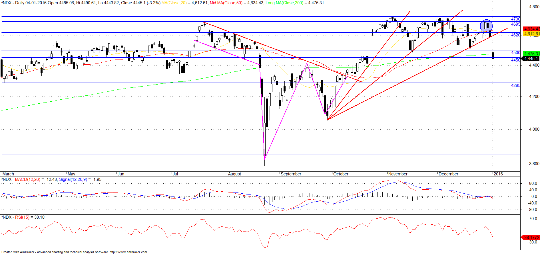 The Dow Jones industrial average traded about 400 points lower, down more than 2 percent, on pace for its largest percent decline on the first trading day of the year since 1932. ( Tweet This ) Earlier, the index fell more than 450 points, down more than 2.5 percent.