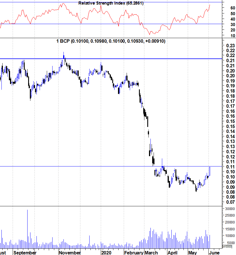 Deixo os gráficos actualizados do BCP depois desta subida violenta, depois de ter realizado mínimos hist´óricos. A acção enfrenta agora a sua primeira resistência na zona dos 0,11 euros.