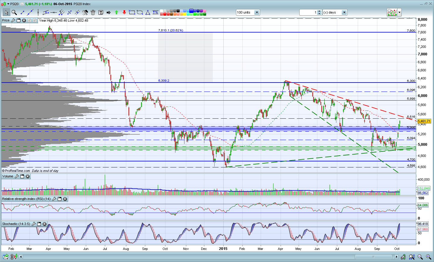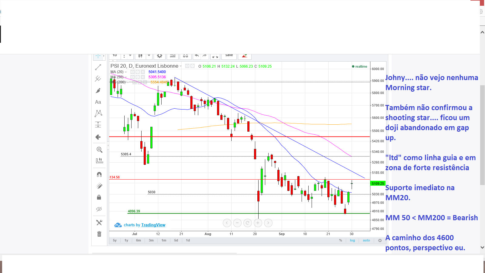 No entanto, a morning star está lá e é um forte padrão de reversão desta tendência descendente do PSI. Se quebrar a LTD terá ainda a resistência nos 5300... Tem bastantes muros para partir ainda, veremos...