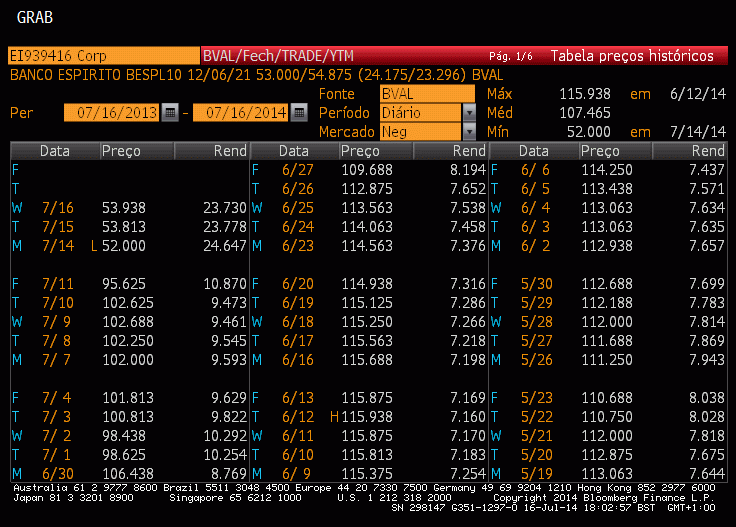 Séniores, maturidade em 21 de Janeiro 2015 e yields a rondar os 8%!! O Valor nominal são 50k e o preço de compra neste momento deve andar pelos 98! A partir de que preço vos pareceria apetecível?