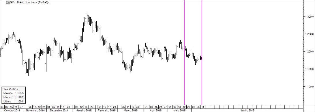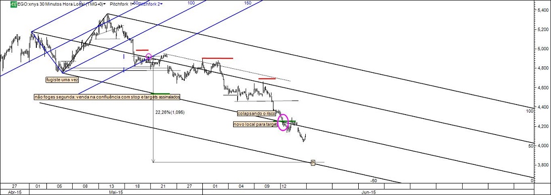 Vamos admitir que, como bom malabarista que sou, gosto de comparar vários time frames para realizar os meus negócios. Como queria shortar o EGO, empresa ligada à extracção de ouro, decidi acompanhar o preço deste no mercado de futuros; afinal, são mercados correlacionados. As linhas balizam o período de tempo durante o qual a posição shortista esteve aberta. Compare-se os gráficos no sentido de extrair do n.º 2 informação que pudesse ter sido usada para o negócio aqui colocado à vista de toda a gente (nada habitual ultimamente).