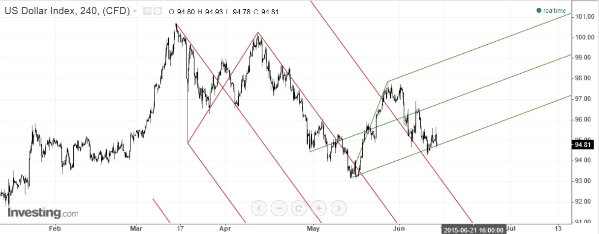 dado que o activo referido no post anterior é um par com o dólar, deixo as forks que estou a ver no us dollar index. a saída cada vez mais aparente, pelo menos para já, da zona de influência da fork vermelha e, simultaneamente, a localização na LMLH da fork verde, em zona de suporte, parece apontar para uma subida deste índice, facto que poderá ser tido em conta para entradas curtas em pares "?"/dólar.