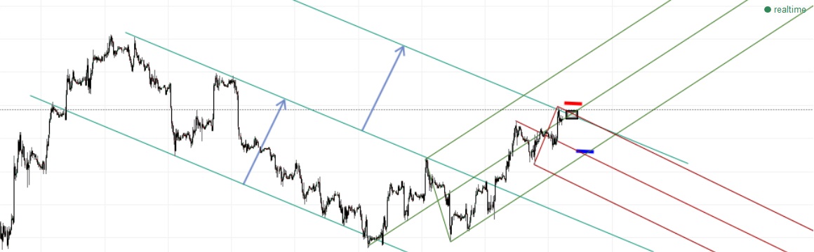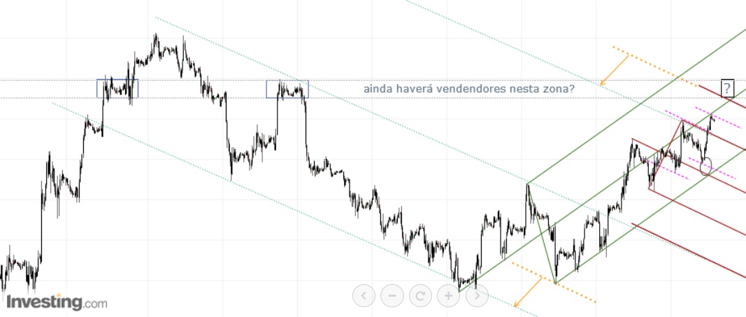 O preço fará o que tem de fazer, estaremos cá para ver. Se entretanto descer, na stop há-de bater. Uma vez quebrado o anterior swing high, será o risco colapsado. O fork do 2º gráfico poderá referenciar outros locais para targets.