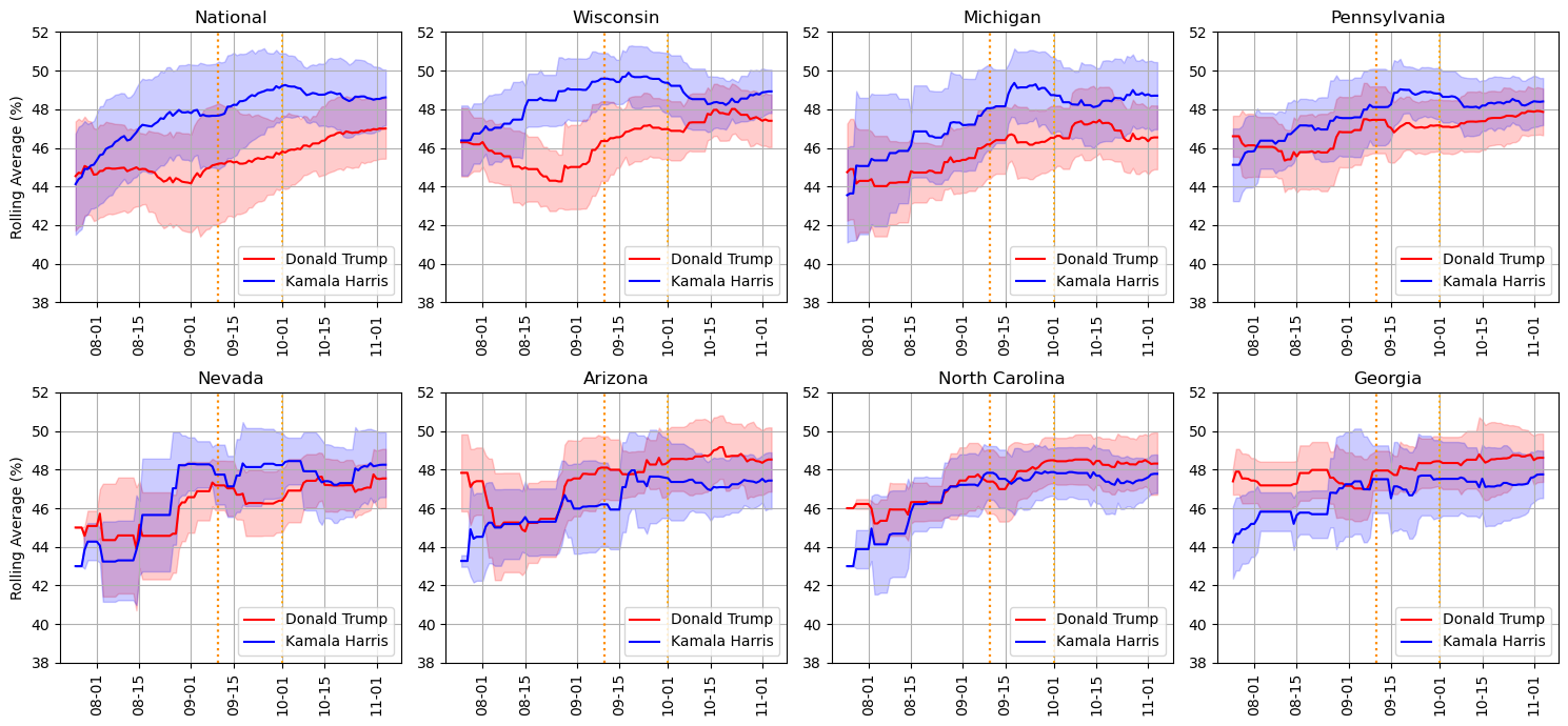 Nas nacionais o teu agregador tem a Harris à frente e a fivethirtyeight, Economist e 270towin também por 1%, 1,5% e 1,2%, enquanto que a real clear e a hill dão uma vantagem ao Trump de 0,3% e 0,2%. A média das 5 é 0,64% a favor da Harris