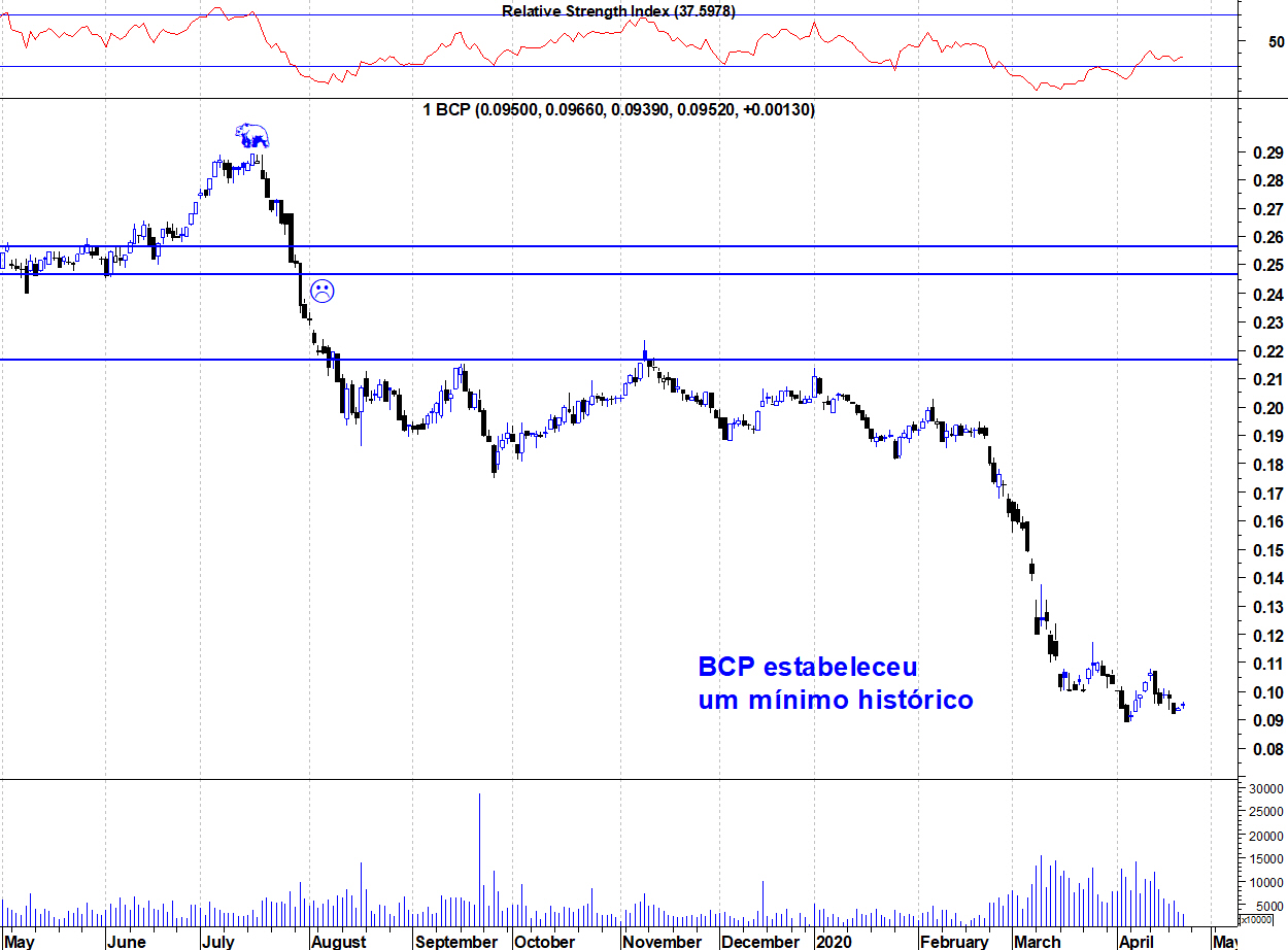 O gráfico deve ter problemas nos ajustamentos, o BCP está em mínimos históricos...
