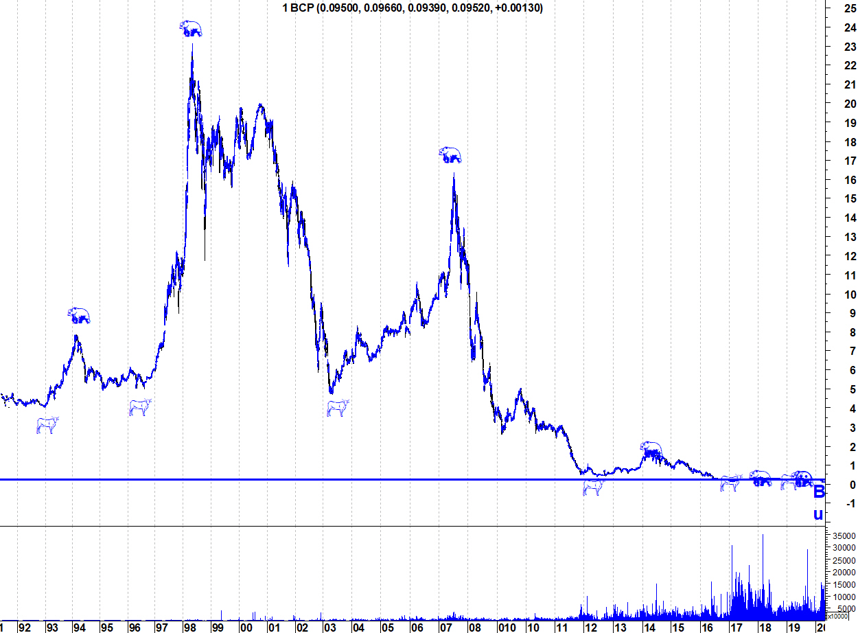 Os gráficos mostram o S&P500 por exemplo a cerca de 20% dos máximos de sempre e este mostra o BCP a arrastar-se em mínimos de sempre, que distam do máximo relativo dos últimos 5 anos em mais de 300%...