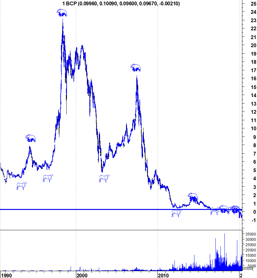 Aqui deixo os gráficos actualizados do BCP que continua sem dar qualquer sinal de força e está encostado aos seus mínimos históricos. O gráfico de longo prazo mostra bem a ascensão e queda de um império.