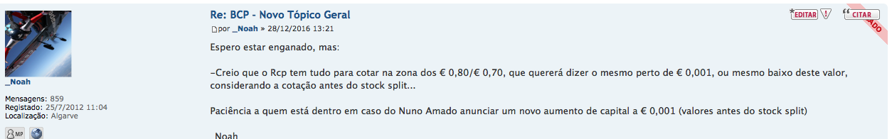 Eu não quero saber se vens do 3º, 2º, 6º AC, o link é apenas para evidenciar a destruição e diluição de capital que o BCP provoca desde a sua constituição, daí a questão que se devem colocar - Porque invisto em bolsa? Será para ganhar algum dinheiro com isso?