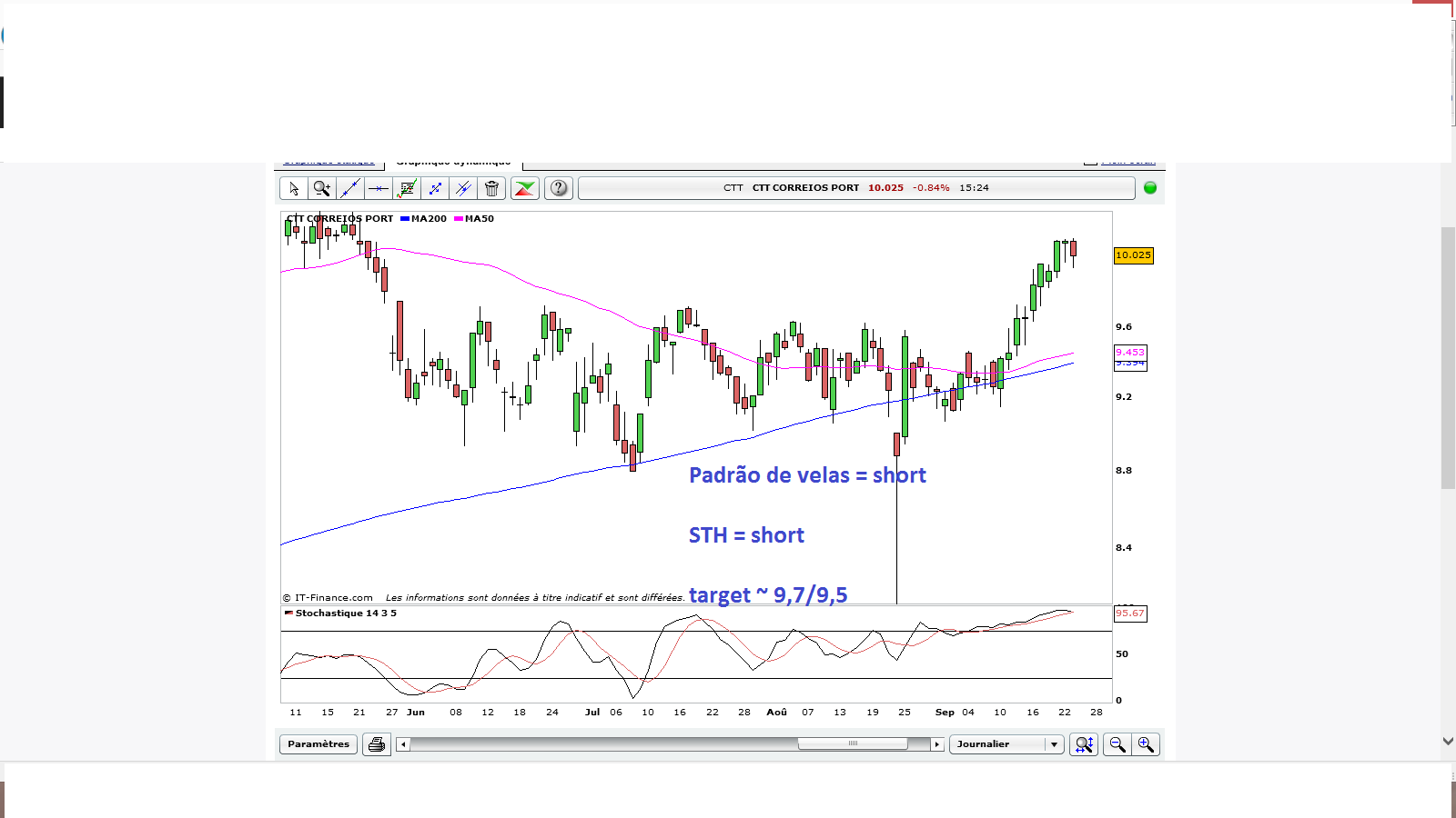 Ao utilizar a minha estratégia de trading consegui fechar 1/3 da posição e mover o stop para a posição de abertura, pelo que o lucro está à partida garantido com o trade, mas espero que este ainda cresça. Eu faço trades de curto prazo, logo não acompanho a tendência primária, e a verdade é que fez ali uma espécie de hanging man numa resistência com o stochastic elevado. Isto cada um com os seus sistemas, o importante é entrar se as regras de trading forem concretas e apontarem para tal, nada de hesitações. Muitas vezes não dá certo, é verdade, mas eu não ando cá para adivinhar o futuro com toda a segurança, mas sim para ganhar dinheiro à moda do Douglas.