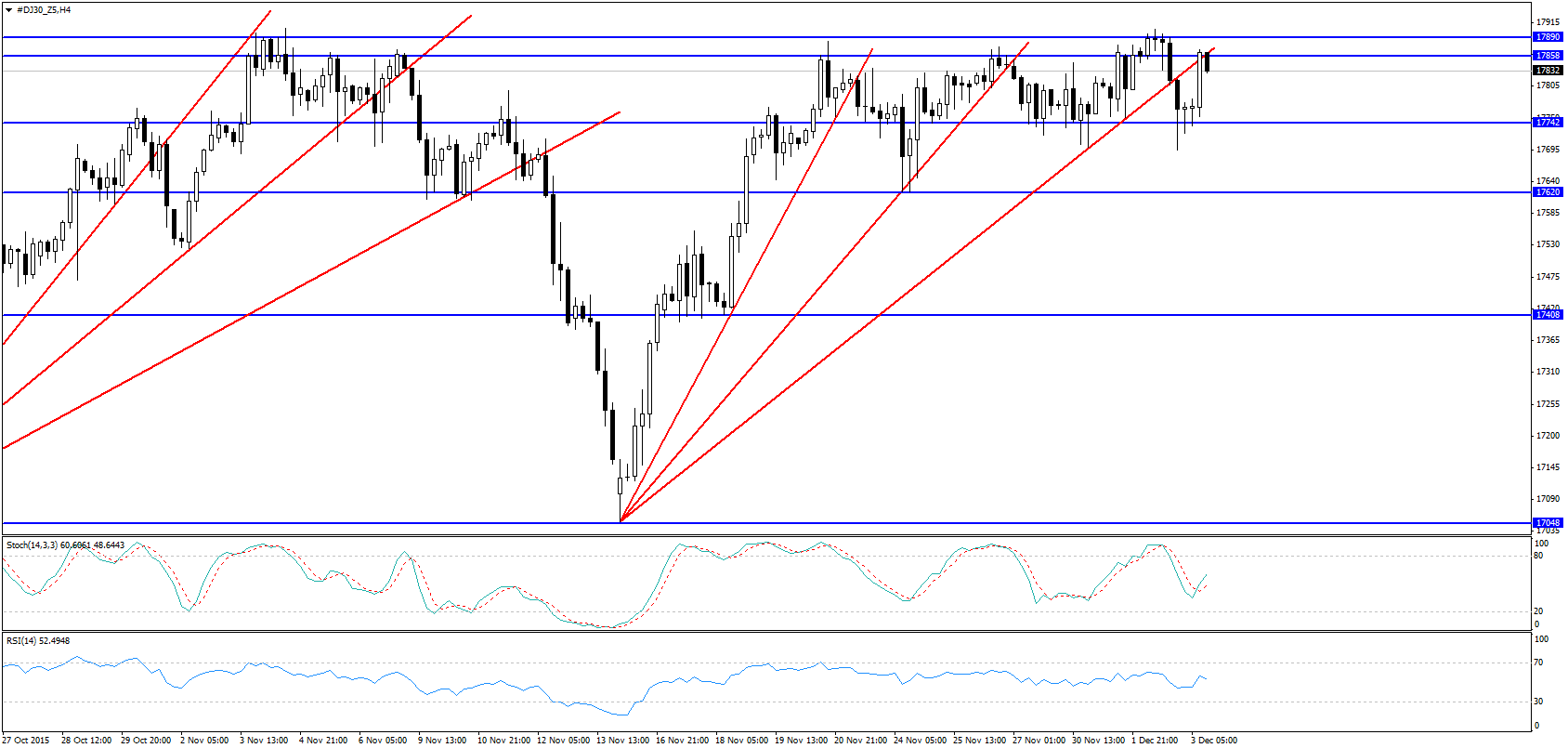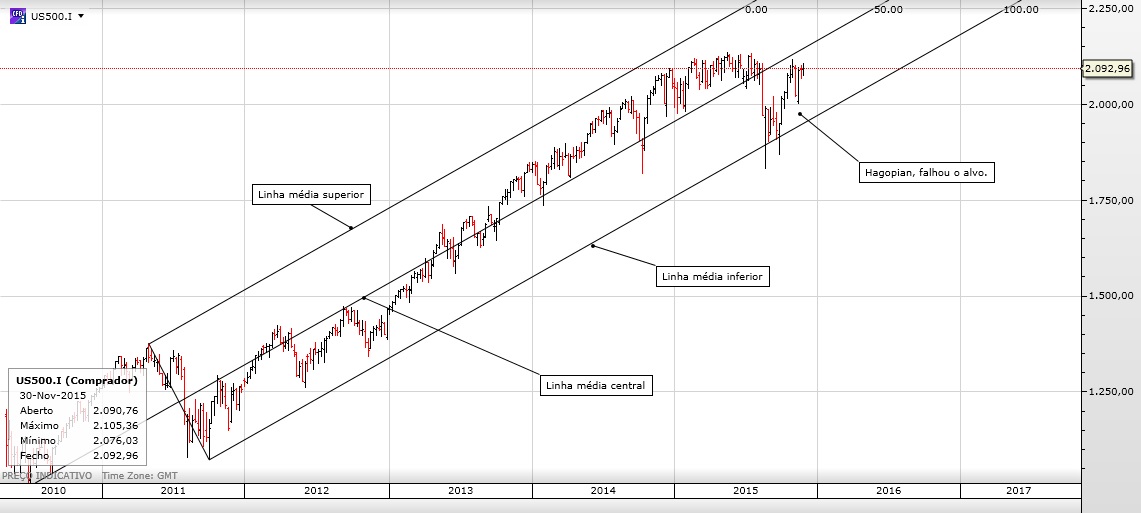 a) Em novembro a linha média, depois de meses como suporte, atuou como resistência, no entanto o preço não veio novamente à linha média inferior. Pode não ter vindo porque ainda não teve tempo ou porque se formou um Hagopian, um Hagopian é algo que se pode resumir como algo do tipo: se não foi onde deveria ter ido, irá no sentido oposto e mais longe (se não é carne é peixe). Este é o cenário altista, e é validado (na minha opinião) com o atravessamento para cima da linha média, se for em gap, então é um must;
