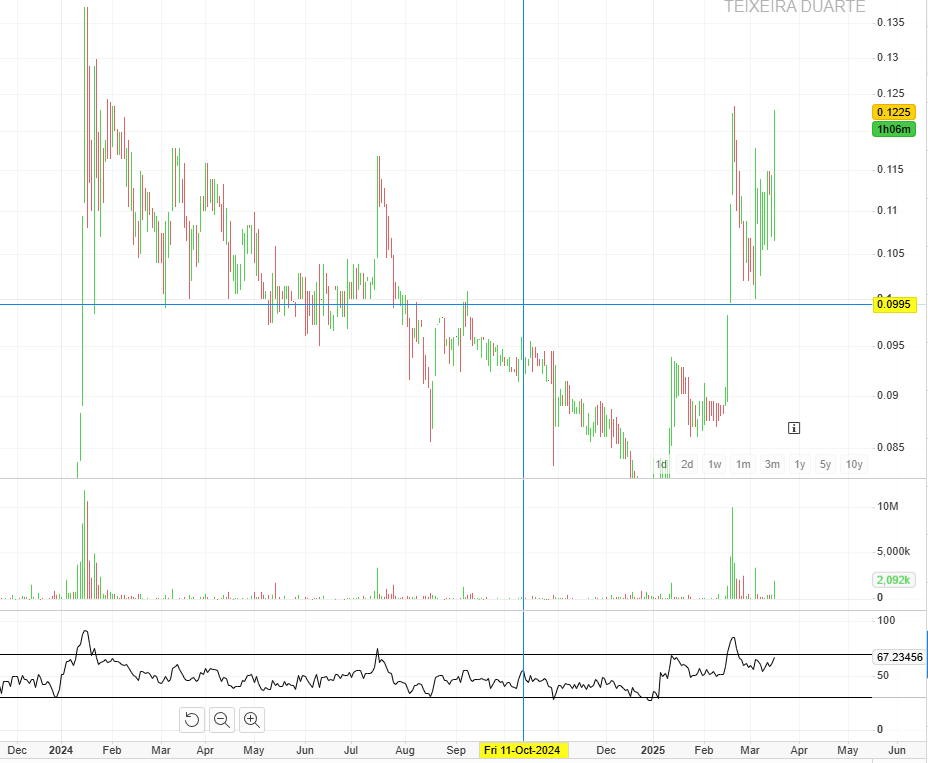 Ora que grande dia que está a ser, TD hoje passa com força os 0.14€. Temos resultados sexta feira, que acredito serem positivos. Com a quantidade de obras publicas que andam a ganhar, junto com o ramo imobiliário acho que vamos ter um ano muito positivo para ela.