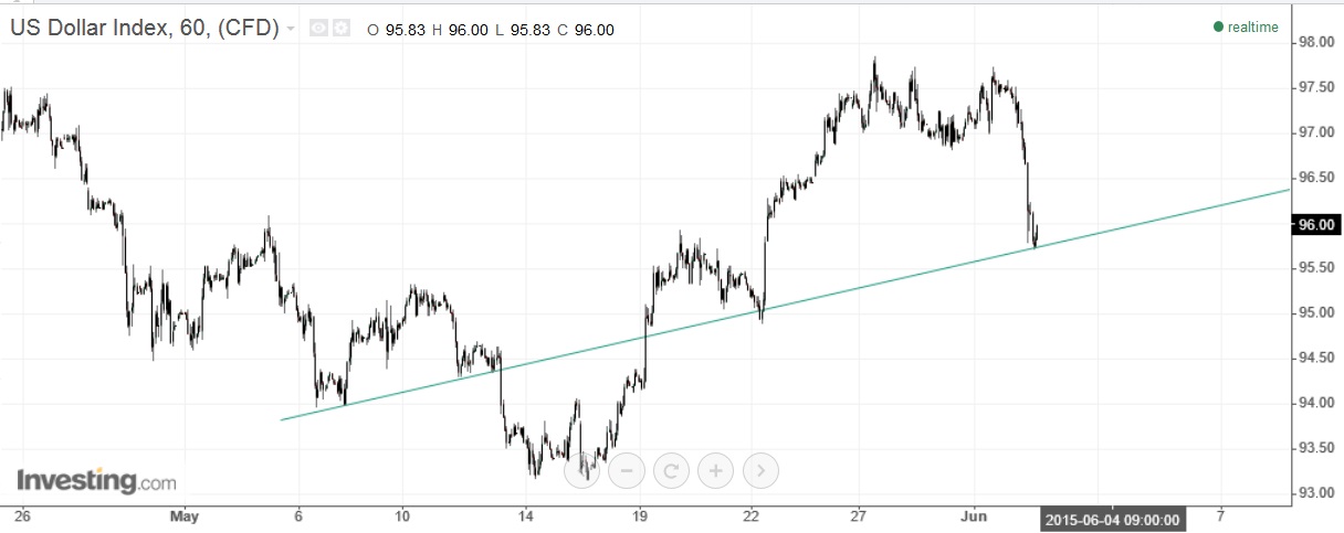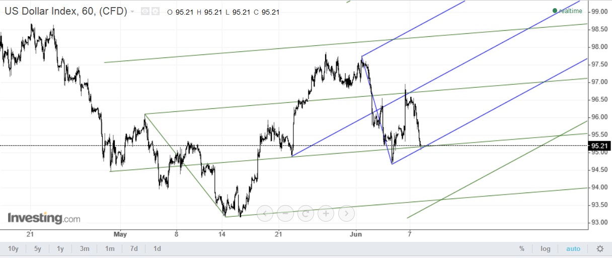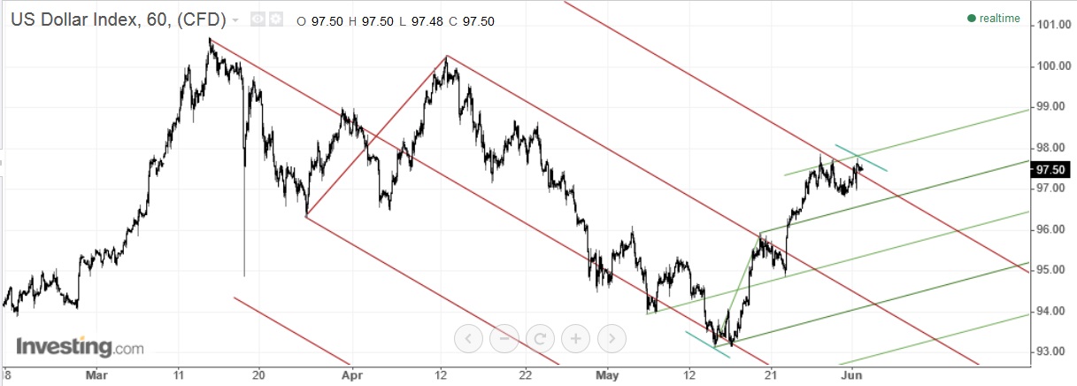 2 gráficos: eur/usd e us dollar index antevendo a subida do dólar e a queda do euro no muito curto prazo.