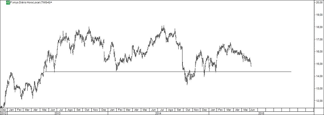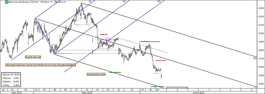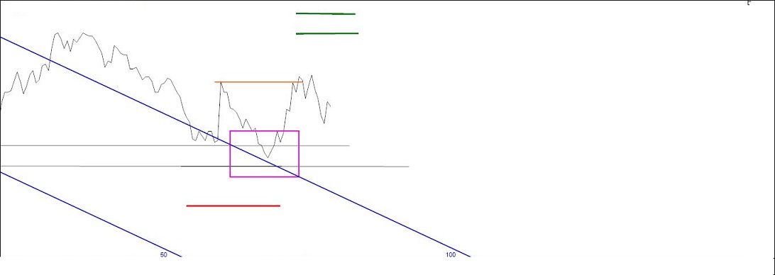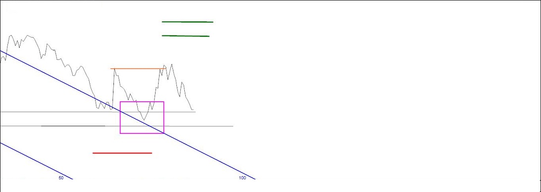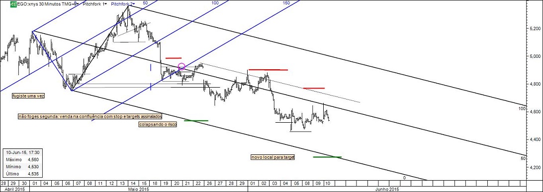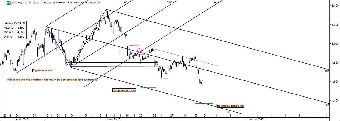 No dia 16-5 apresentei um gráfico e escrevi:Uma oportunidade especulativa vendedora para a próxima semana/15 dias: as linhas e as zonas falam por si. Dois potenciais locais para colocação da stoploss, tudo dependendo do modo como o preço se comporte, e dois targets. É mister que, chegando a uma das linhas, o preço mostre fraqueza.