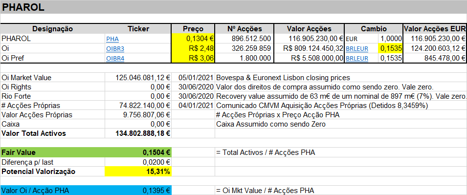 Quadro-resumo abaixo, com indicação do fair value da PHA, isto é, onde ela deveria estar a cotar tendo em conta o valor dos activos detidos, explicados no quadro.