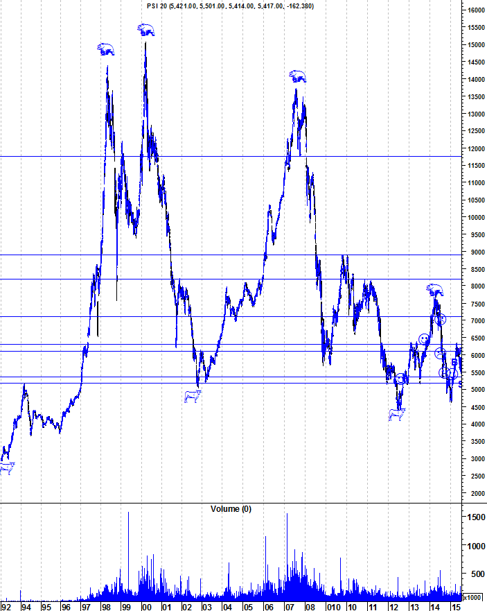 Aqui ficam os gráficos actualizados do PSI, numa altura em que o índice está cada vez mais afastado da fronteira entre o Bear e o Bull Market e cada vez mais perto do seu suporte.