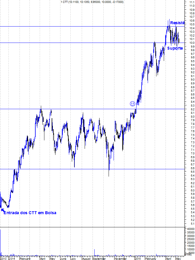 Resolvi entrar hoje longo nos CTT com stop algo justo,vamos ver se nesta lateralização a ação aguenta o actual suporte ~10€