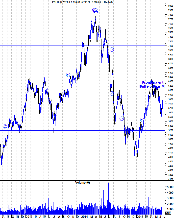 A Bolsa portuguesa leva mais de 2 meses de quedas, travando o entusiasmo que se viveu no primeiro trimestre deste ano. Não posso dizer que seja surpreendente. Há alguns meses que me referia à zona entre os 6100 e os 6300 pontos do PSI como a grande fronteira entre o “Bear” e o “Bull Market” e, apesar das críticas sobre esse meu excessivo conservadorismo, sempre mantive essa posição pela importância dessa resistência que acabou por travar esse ressalto da Bolsa portuguesa nos primeiros meses deste ano.