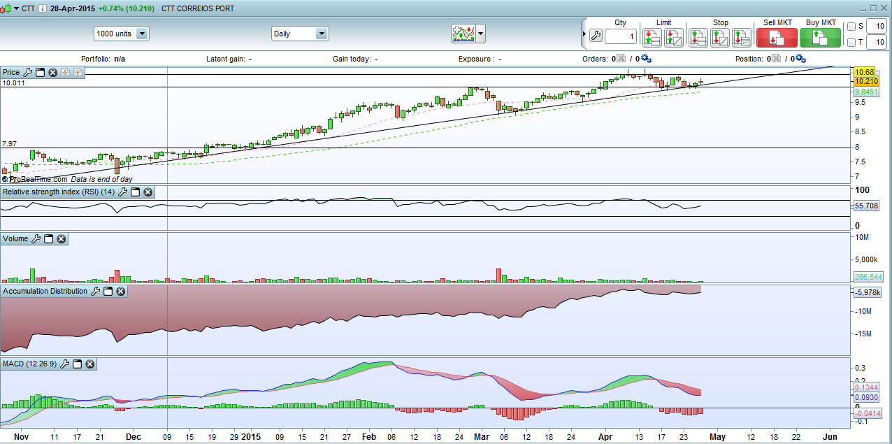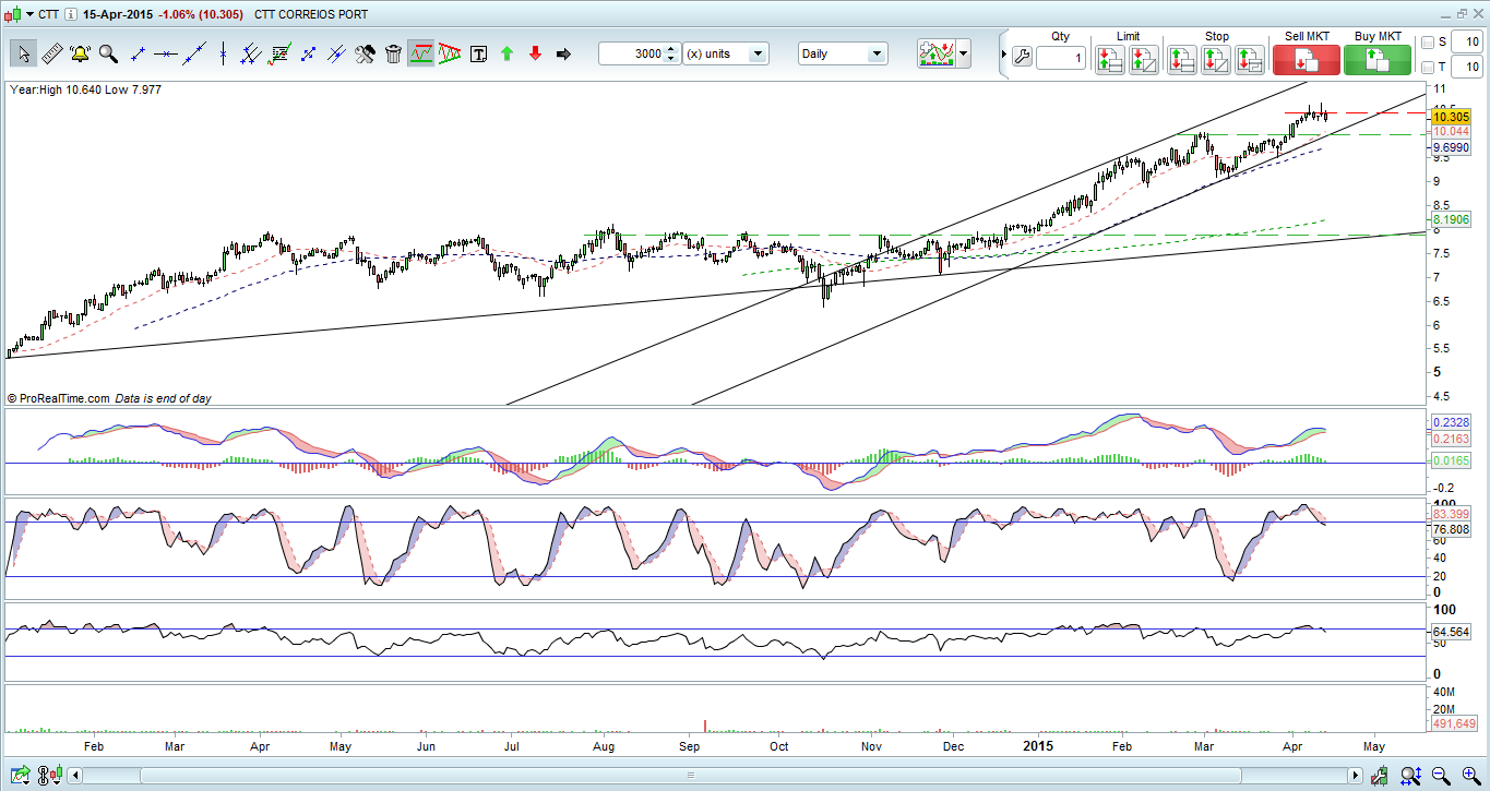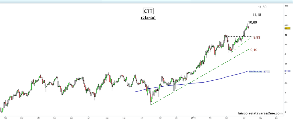 Os CTT criaram um LTA desde a sua iniciação em bolsa, e que será sempre um importante suporte a ter em conta. No entanto estamos longe desse nível, que agora se situaria perto dos 7,90, dado que desde Novembro do ano passado criou um canal ascendente que se tem mostrado firme e que rege para já o que os investidores retiram da analise do seu gráfico.