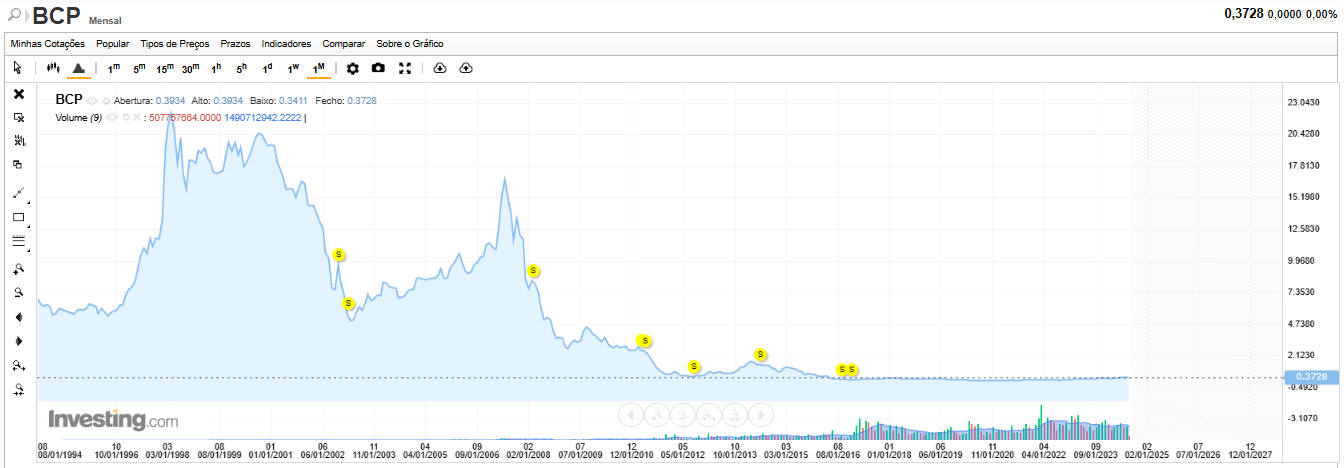 No caso do BCP os acionistas perderam quase tudo, como se comprova pelo gráfico. Foi como se o BCP tivesse falido. Só não faliu, efetivamente, porque o Estado injetou dinheiro no BCP. A injeção de dinheiro por parte do Estado e o aumento de capital posteriormente feito pela Sonangol e pela Fosun equivaleram a uma refundação do BCP. Foi, de certo modo, como se o BCP tivesse falido e tivesse nascido de novo. Para os anteriores acionistas do BCP isso não fez grande diferença, tiveram que arcar com perdas de mais de 90 %, perdas semelhantes àquelas que ocorrem em situação de insolvência!!! Apesar de o BCP não ter realmente falido os seus acionistas não se livraram de perdas semelhantes às que ocorrem em situação de falência, pois o BCP foi objeto de "refundação", como se tivesse falido!!!