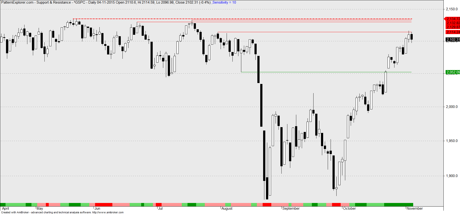 Acredito que possa haver amanha uma pequena paragem neste ponto, até porque hoje o preço já esteve perto dos 2120, mas continuo convicto que estas pequenas paragens ou pequenas tomadas de mais valias deverão ser aproveitadas para comprar, uma vez que acredito que iremos visitar máximos históricos no curto prazo neste índice tal como no NDX.