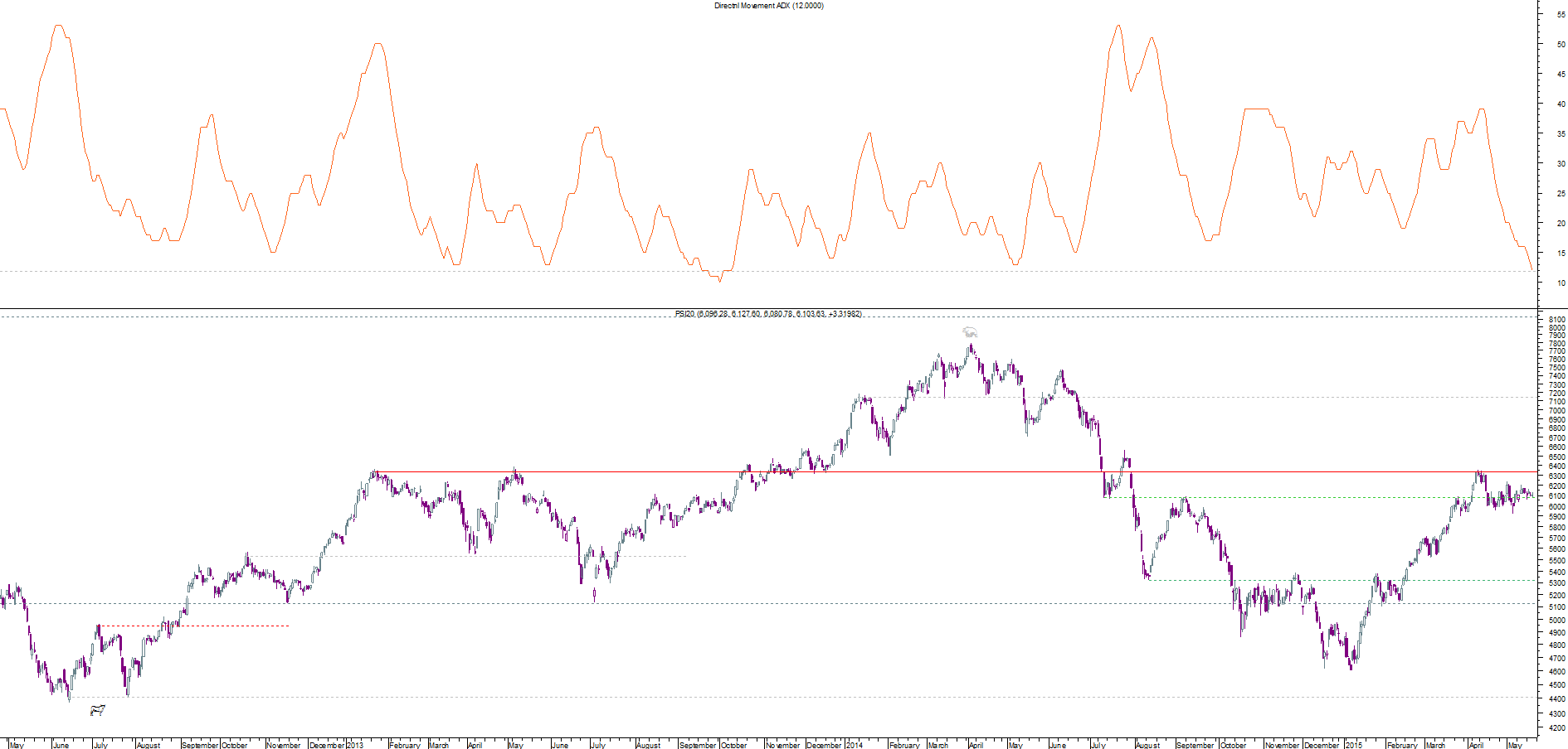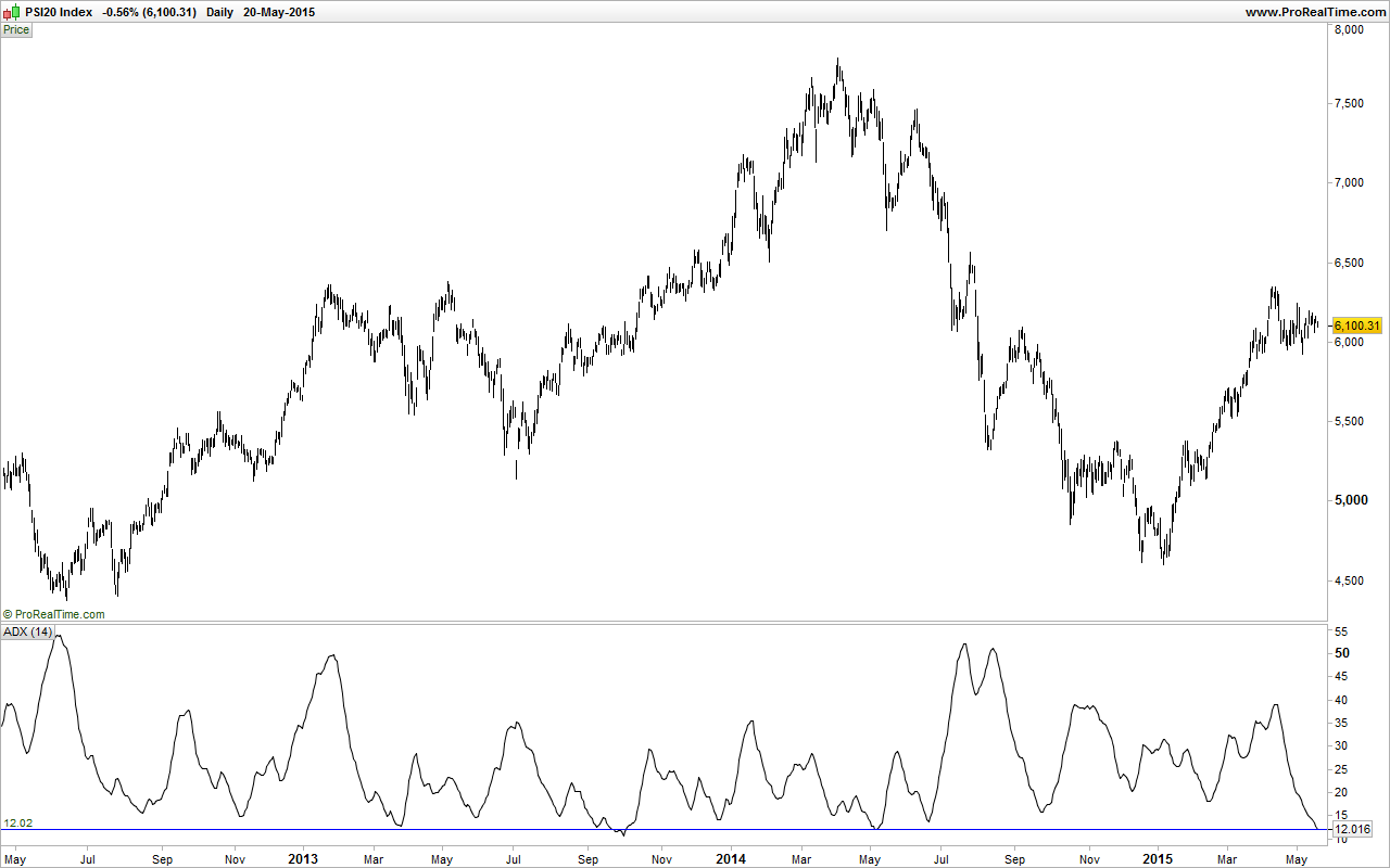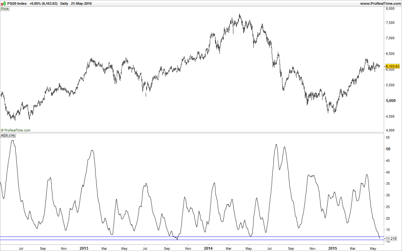 Desde o mínimo de 2012, o ADX(14) só atingiu valores abaixo do valor de hoje em setembro de 2013 e Maio de 2014.