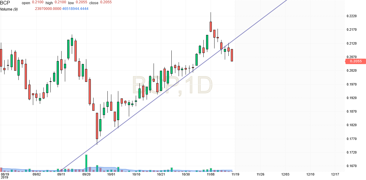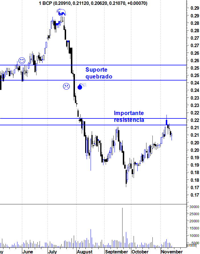 Se não segura aqui nesta linha de suporte de curto prazo, o target de um eventual HS formado nestes dias de Novembro é nos 19 e pouco...