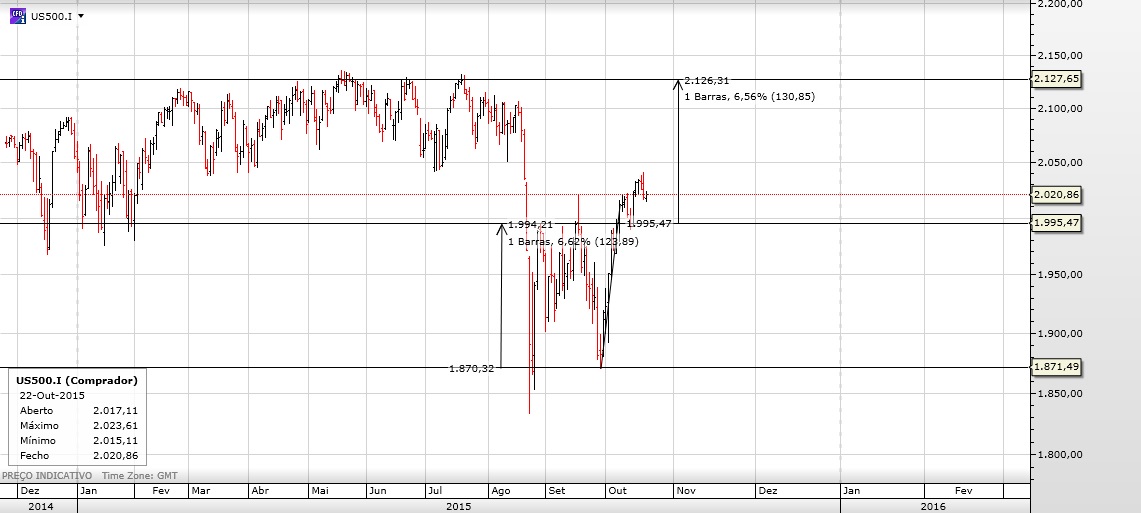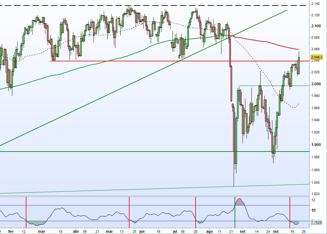 No entanto, também partilho da ideia que os institucionais se estão a preparar para começar a despejar, o volume deste rally assim o parece indicar. A promessa de juros inalterados não é na minha óptica razão suficiente para sustentar os mercados, quando temos constantemente os dados económicos a sugerirem um abrandamento global. Penso que tal acontecerá dia 28 de Outubro, quando a FED anunciar a sua decisão em que teremos um clássico buy the rumor, sell the news (tal como aconteceu em Setembro aquando do anuncio da FED com aquele belo spike até aos 2020 no SP500 e consequente visita aos 1870's umas semanas depois), depois do SP500 testar a MM200 e a zona dos 2050-2060.