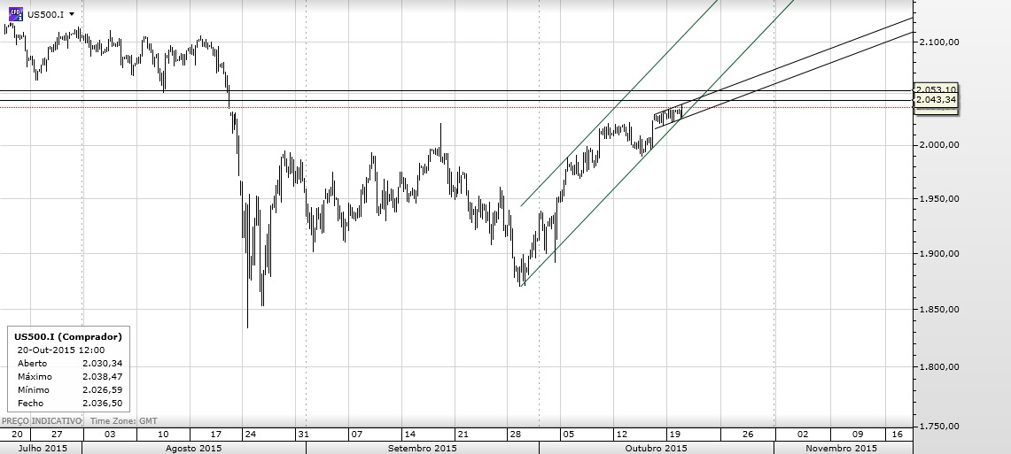 Estando agora acima do que antes era resistência (linha 161 do garfo e resistência horizontal), o mais provável é que agora funcione como suporte, devendo o stop estar abaixo, e como o "abaixo" não é longe, assumindo os 2050 como próxima resistência, a equação de risco-beneficio pode ser interessante.