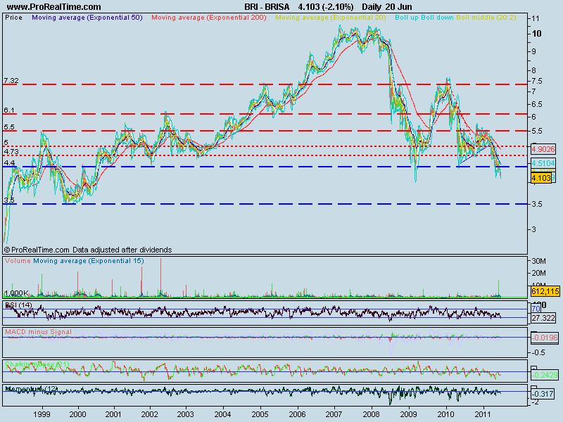 Já agora deixo um gráfico actualizado. Quebrou os mínimos relativos de 2009 (que eram de 4,26) e o fecho de ontem e de hoje a 4,103 é o mais baixo desde 2000 - temos portanto a Brisa em mínimos de 11 anos.