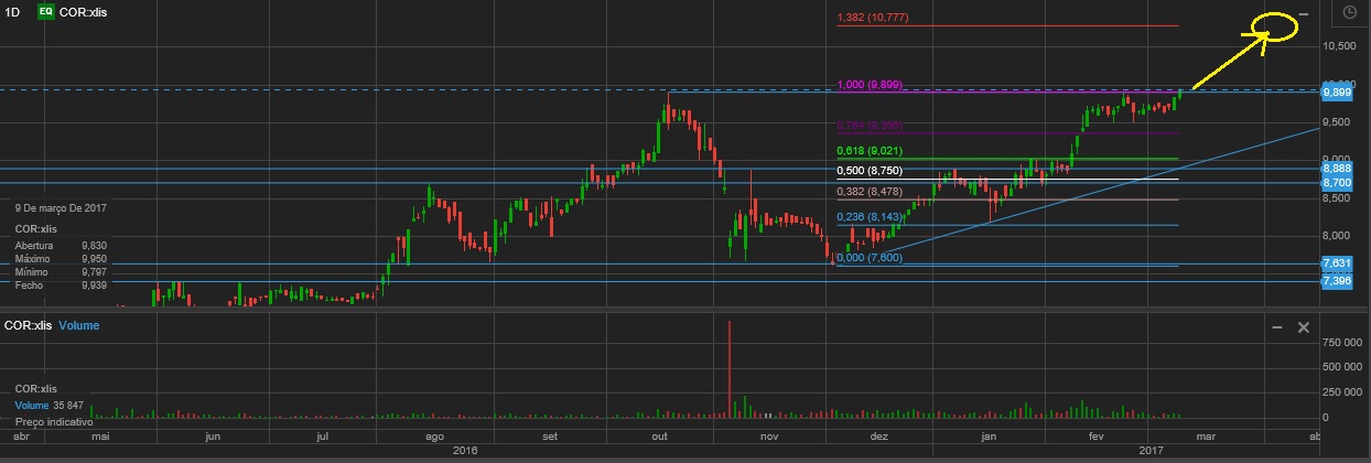 A setinha significa o trajecto que eu prevejo para o preço, numa primeira fase, a partir do momento que fez hoje máximo histórico (e fechou acima do anterior máximo), até atingir aquela que considero a próxima resistência, dada pela projecção fibonacci de 38,2%.