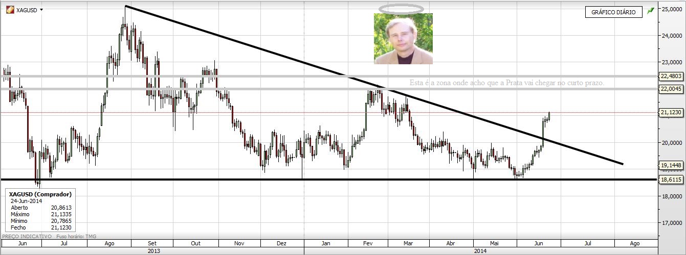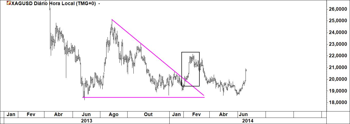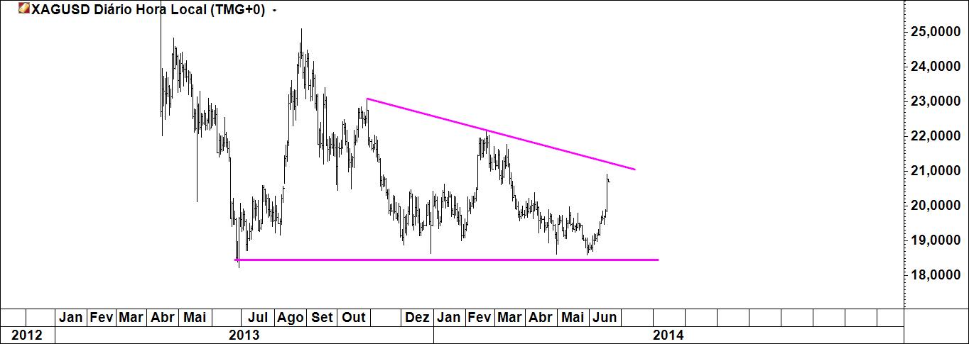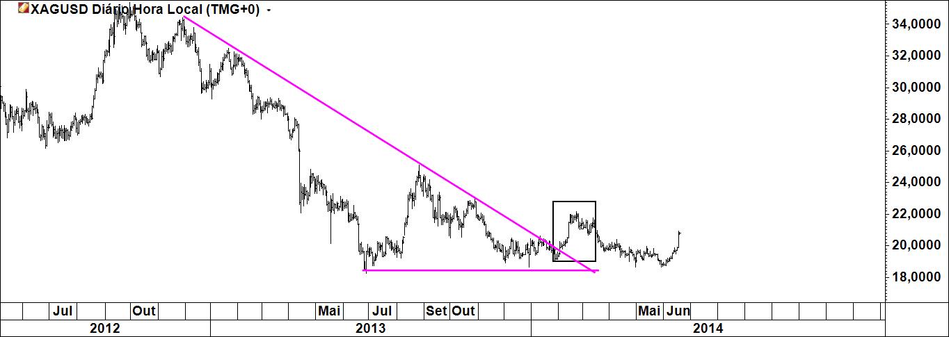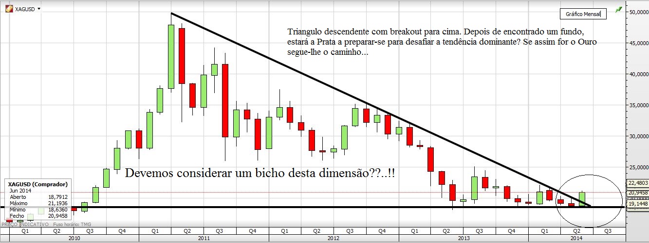 Mas de facto este Triângulo Mensal da Prata é de facto um Triângulo. Resta saber é se funciona, mesmo nestas condições e se der resultados se foi por estar ali um Triângulo. Mas a formação pode não ser o mais importante, até a podemos esquecer. O mais importante é que há uma quebra de uma LTD no gráfico mensal que vem do início de 2011. Isto é significativo e não invalida a ideia que deixo no gráfico do post anterior.