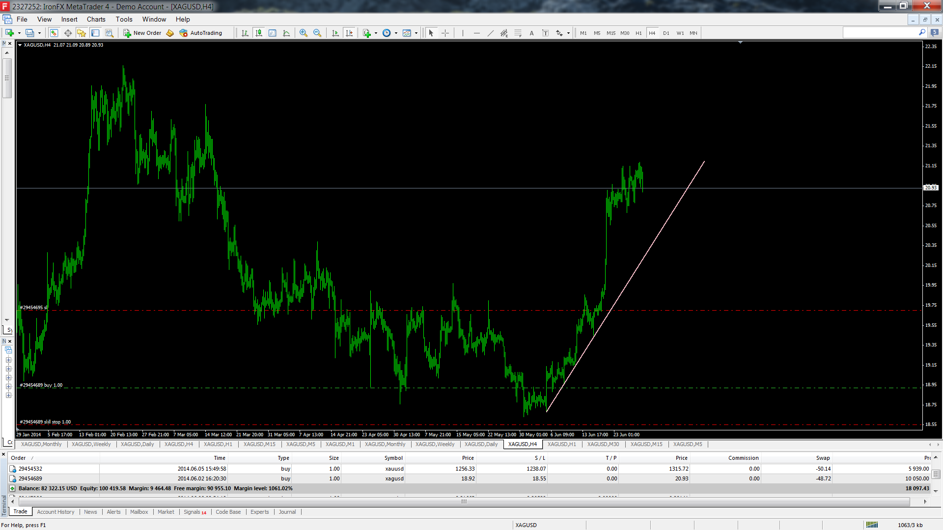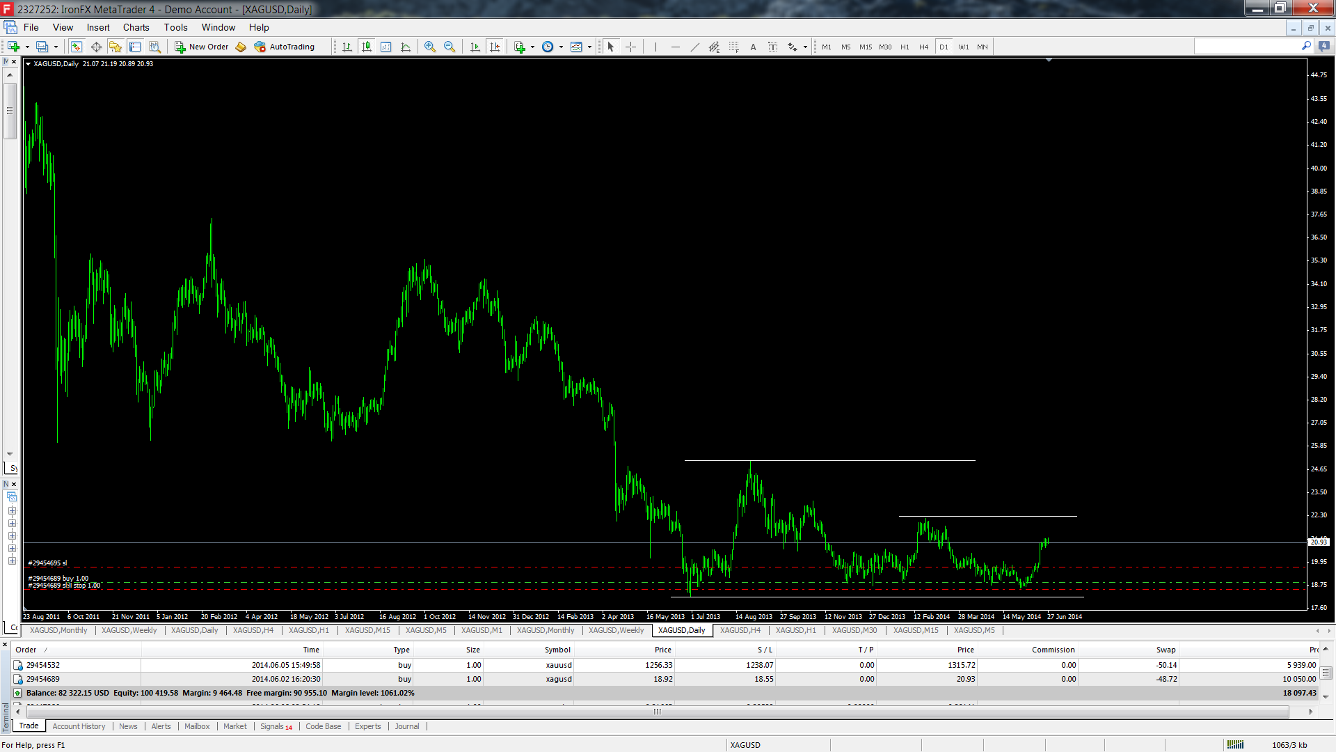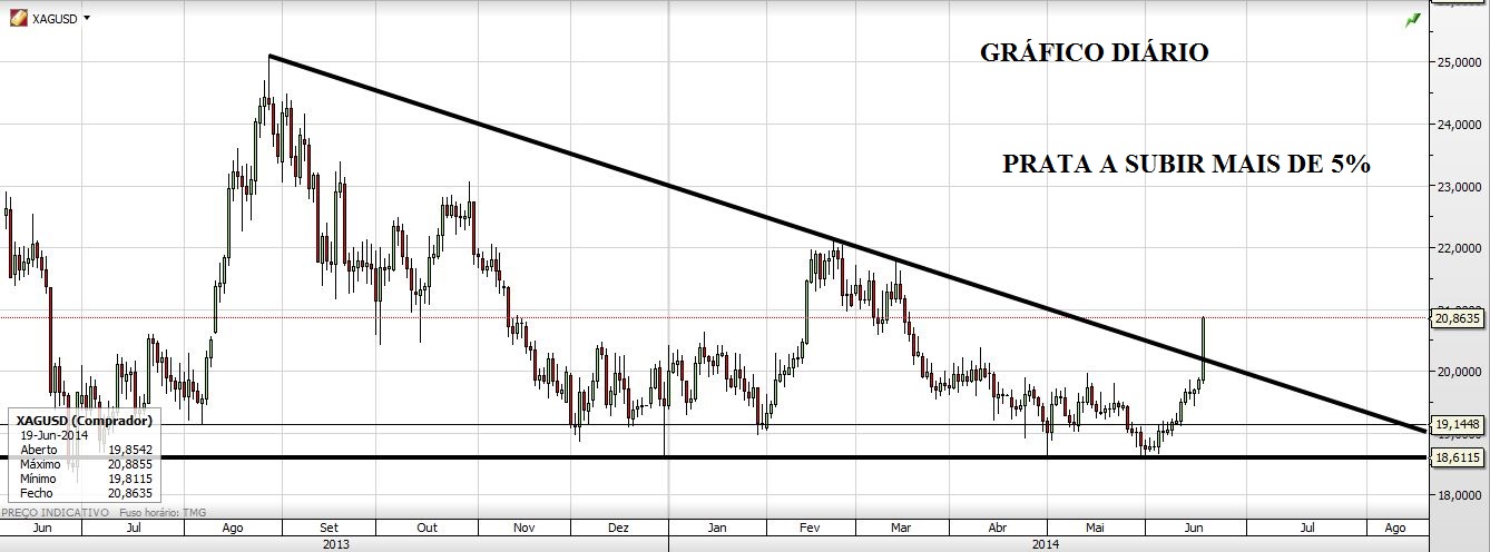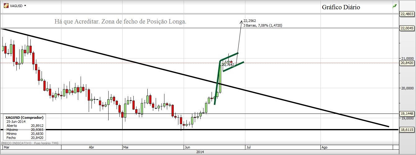 Mas de facto este Triângulo Mensal da Prata é de facto um Triângulo. Resta saber é se funciona, mesmo nestas condições e se der resultados se foi por estar ali um Triângulo. Mas a formação pode não ser o mais importante, até a podemos esquecer. O mais importante é que há uma quebra de uma LTD no gráfico mensal que vem do início de 2011. Isto é significativo e não invalida a ideia que deixo no gráfico do post anterior.