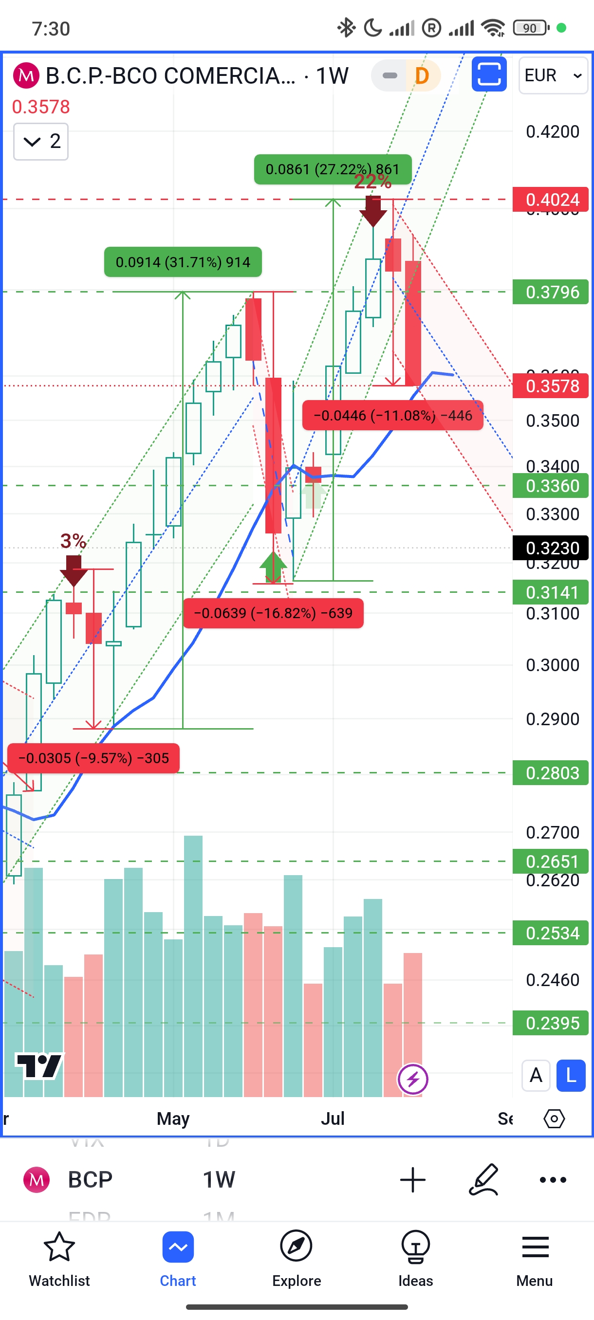 BCP acima dos 0.39€ de novo. O valor de 0.4€ testado em Julho vem de 2016: